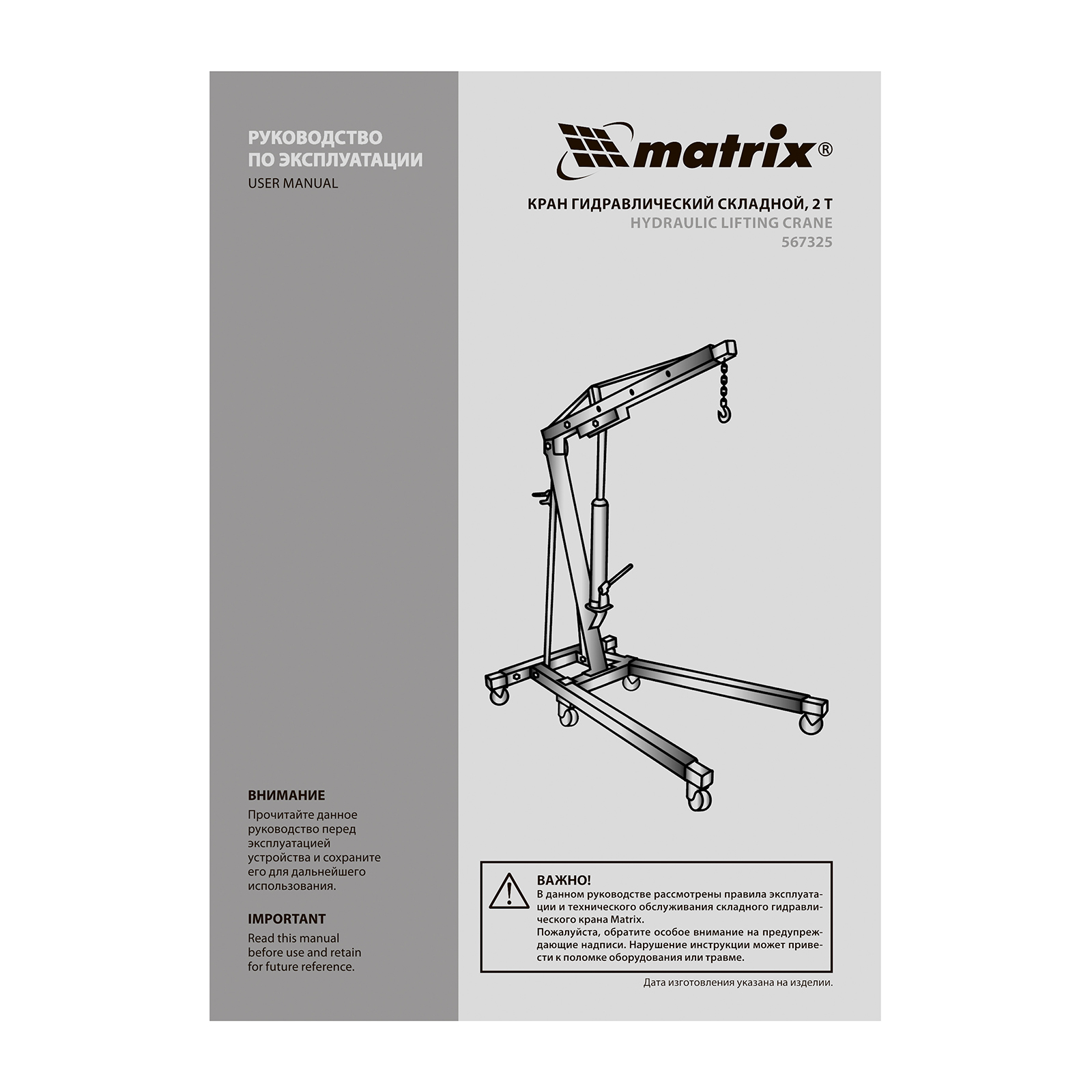 Кран гидравлический, 2 т, H подъема 25-2200 мм, складной (комплект из 2 частей) Matrix в Москве