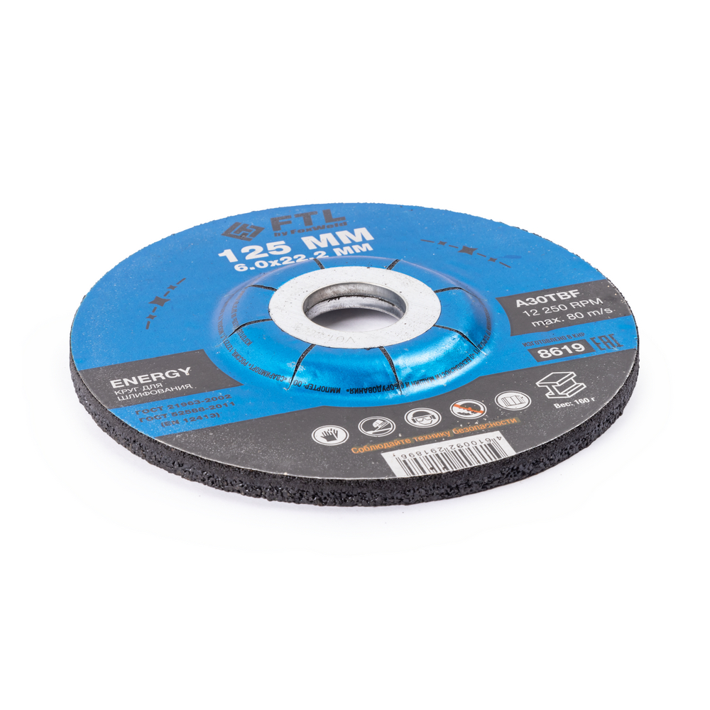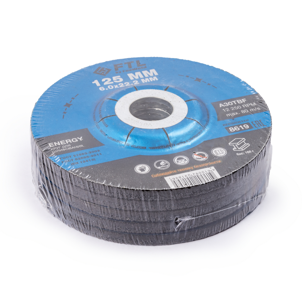 Шлифовальный диск FTL Energy 125 х 6,0 х 22,2 мм A30TBF – расходный материал для ручной угловой шлифовальной машины при работе с изделиями из чёрных металлов (чугуна). Диск предназначен для шлифовки и обдирки разных видов поверхностей, зачистки сварных швов, арматуры, профильных труб, стальных уголков, швеллера, удаления краски, ржавчины, обработки кромок. Поверхность куполообразного диска покрыта слоем абразивных частиц, скрепленных между собой бакелитовой связкой, и армирована одной стекловолоконной сеткой и тканой подложкой. Двойное металлическое кольцо обеспечивает плотную посадку на фланец УШМ, исключая биения и вибрацию при работе. Поставляется во влагозащитной упаковке. Особенность серии ENERGY - крупнозернистый абразивный состав высокой твёрдости для чёрных металлов на базе оксида алюминия. Не рекомендуется для работы с изделиями из нержавеющей стали.ИЗНОСОСТОЙКОСТЬ: Долгий срок службы диска - армирование одной стекловолоконной сеткой и нетканой подложкой плюс толщина связки 6 мм обеспечивают дополнительный запас прочности.УНИКАЛЬНЫЙ СОСТАВ: Технология производства включает в себя эксклюзивный рецепт абразива и смол: применение только твёрдых составов класса ВТ1, ВТ2, армирование сеткой из стекловолокна. Высокая твёрдость связывающей смолы позволяет сделать значительно большее количество съёма металла с заготовки по сравнению с кругами с обычным абразивом.ДВОЙНОЕ МЕТАЛЛИЧЕСКОЕ КОЛЬЦО: Двойное металлическое кольцо на диске обеспечивает плотную посадку на фланец УШМ, исключая биения и вибрацию при работе.ГЕРМЕТИЧНОСТЬ УПАКОВКИ: Диски упакованы в специальную термоусадочную герметичную плёнку, которая предохраняет от пыли и влаги при длительном хранении в условиях повышенной влажности, на строительных объектах и крупных промышленных производствах.ПРЕИМУЩЕСТВА:Для шлифовки изделий из черных металловКупольный профиль ТИП 27 – золотой стандарт для обдирочных и шлифовальных работНаиболее популярный посадочный диаметр 22,2 ммВысокая скорость обработкиКрупнозернистый абразив для лучшего зацепа при шлифованииТвёрдый состав абразиваВысокая износостойкостьДолгий срок службыКрупнозернистый абразив для лучшего зацепа при шлифованииСостав на базе оксида алюминияДвойное металлическое кольцо для плотной посадки на фланец УШМКОМПЛЕКТАЦИЯ: Круг для шлифования FTL Energy 125 х 6 х 22,2 мм A30TBF в термоусадочной плёнке со вкладышем – 5 шт.