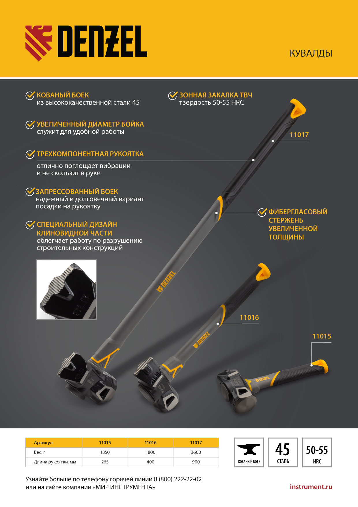 Кувалда Denzel 11015 с клиновидным бойком весом 1,35 кг и фибергласовой рукояткой с TPR-покрытием предназначена для нанесения ударов. Две рабочие зоны делают ее универсальной в работе: клиновидный боек позволяет разрушать кирпичную кладку, конструкции из бетона и камня, а плоский боек — забивать большие гвозди, колья, клинья и выполнять другие ударные работы. Инструмент также подходит для сгибания и придания формы металлическим деталям. Используется при проведении слесарных, строительных и кузовных работ, подойдет и для бытового применения.
