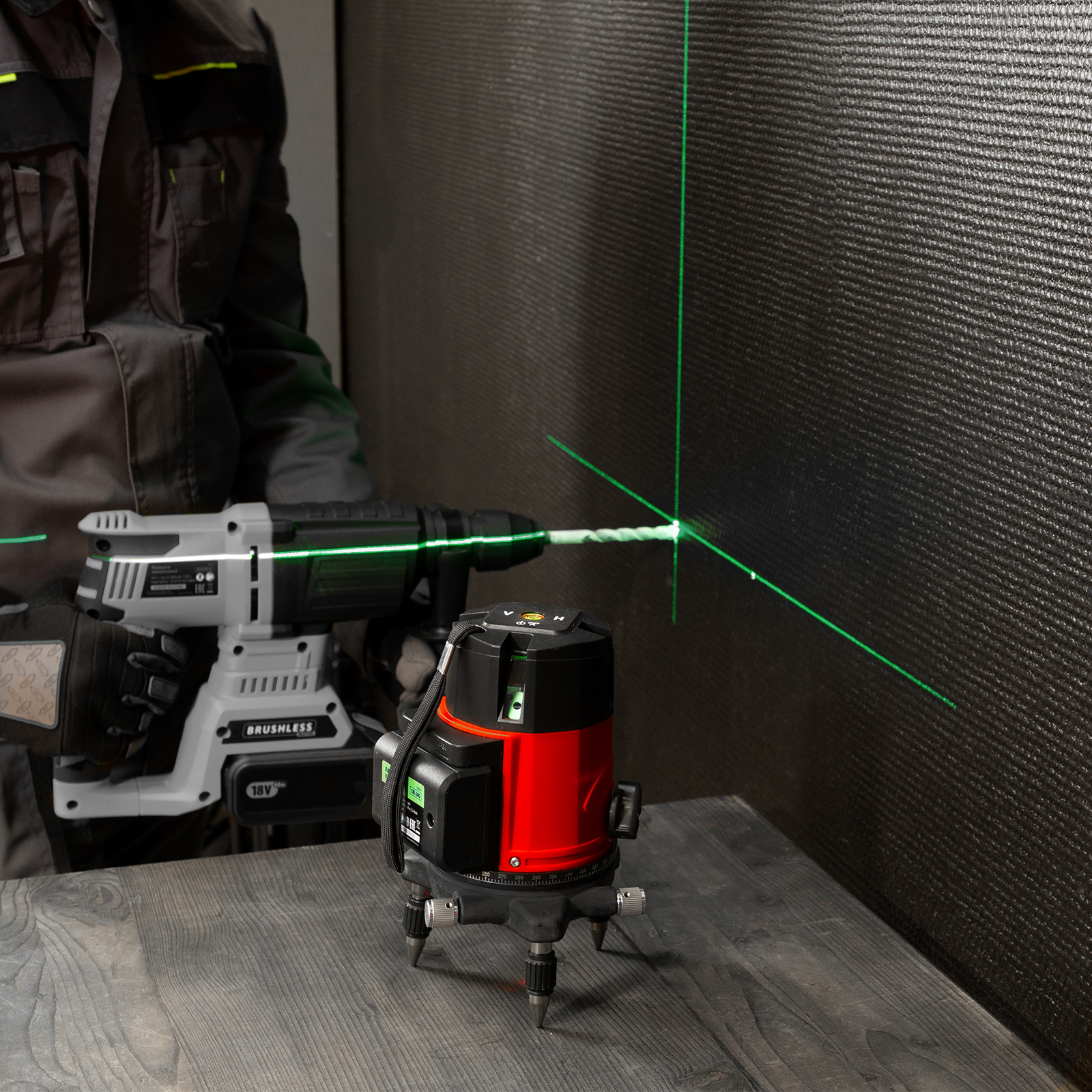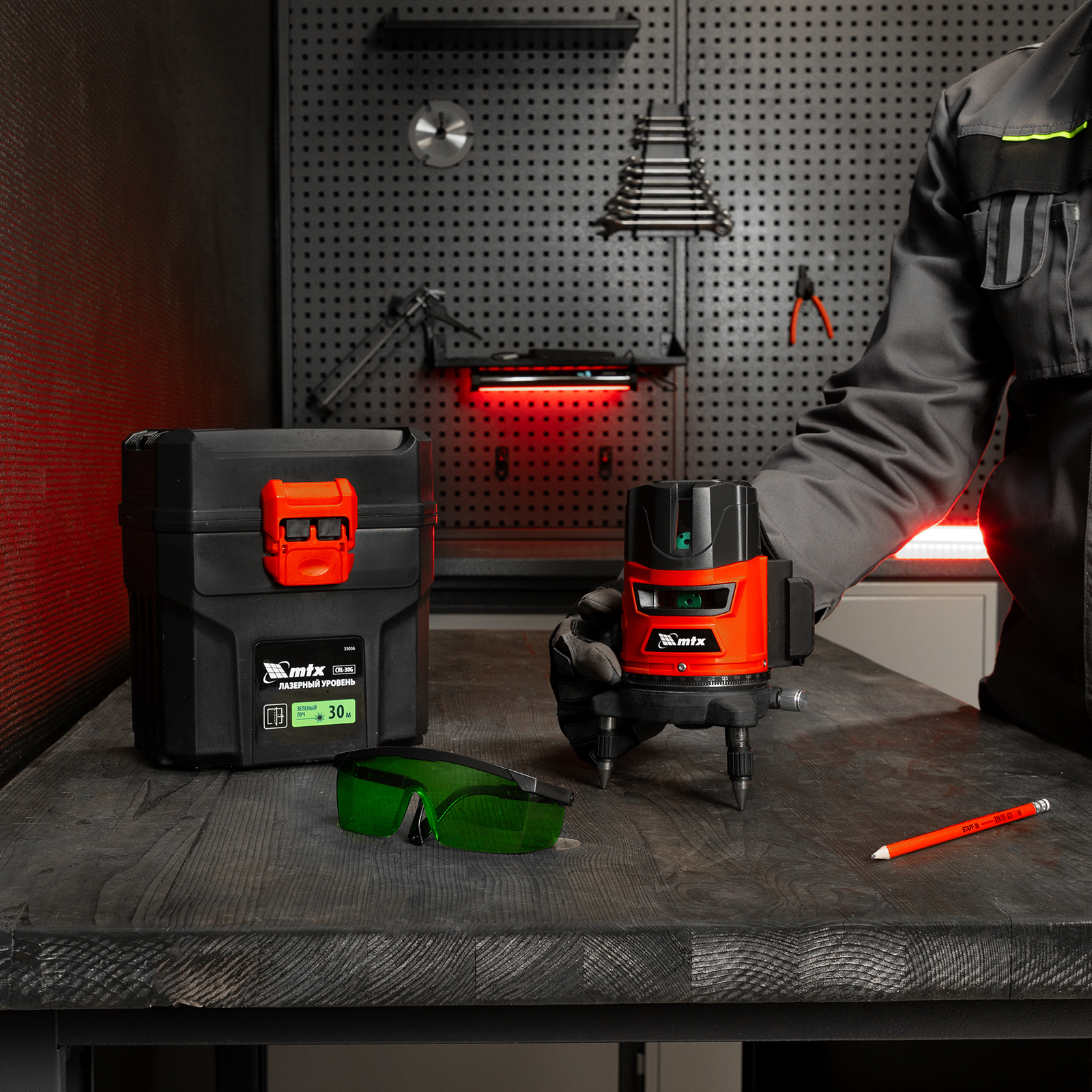 - Широкая комплектация — инструмент поставляется в удобном кейсе, с очками для распознавания лучей на большом расстоянии и при ярком освещении.