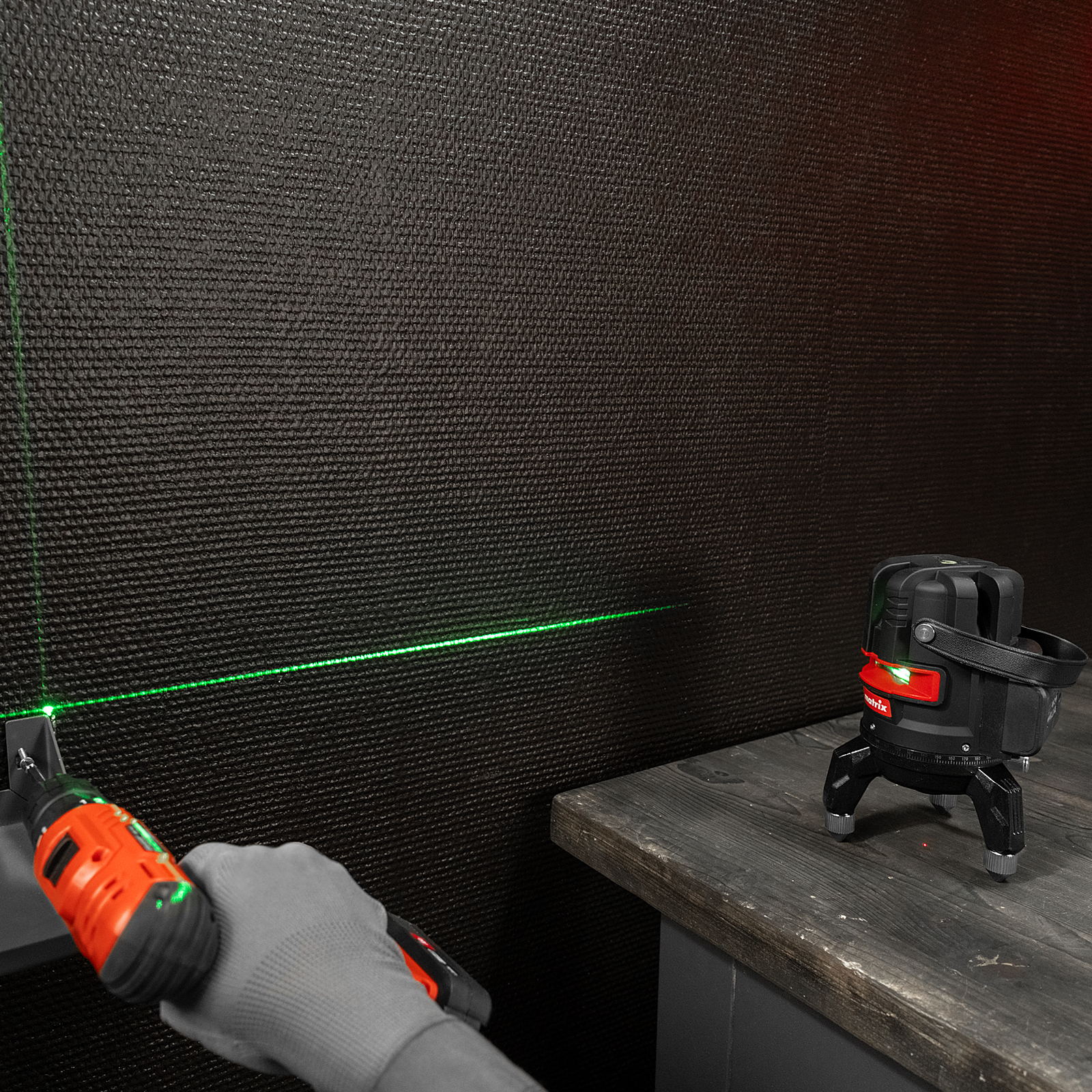 - Точная разметка — устройство работает в режиме автоматического выравнивания лучей (точность ±3 мм/м), а также имеет функцию ручной регулировки при помощи пузырькового уровня, винта точной настройки и регулируемых ножек.
