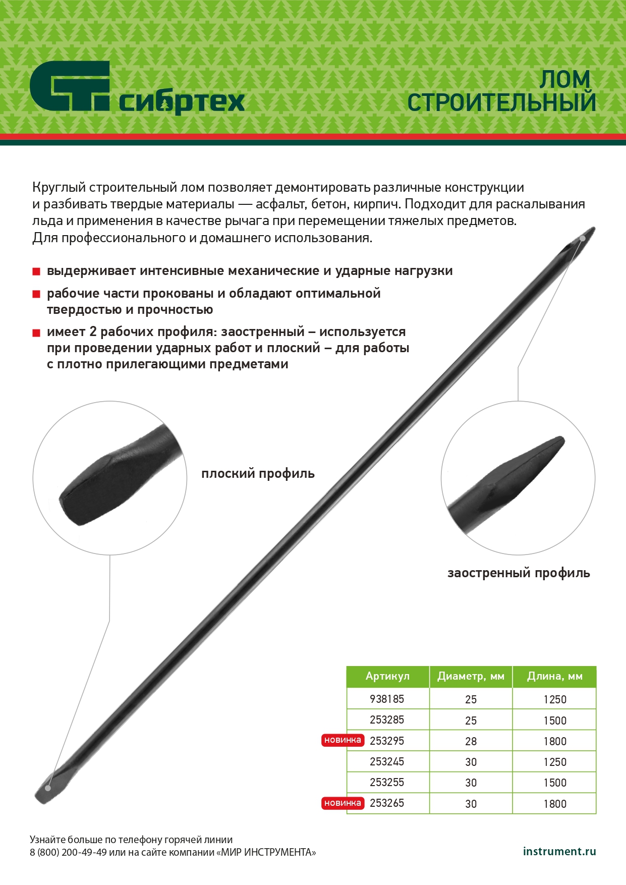 Лом строительный, D 25 мм, L 1500 мм, круглый Сибртех в Москве