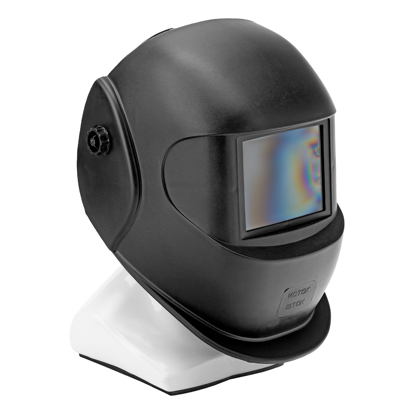 - Комфортная работа — экран обеспечивает хороший обзор во время сварки, а поролоновая накладка минимизирует трение и давление ободка на лоб.