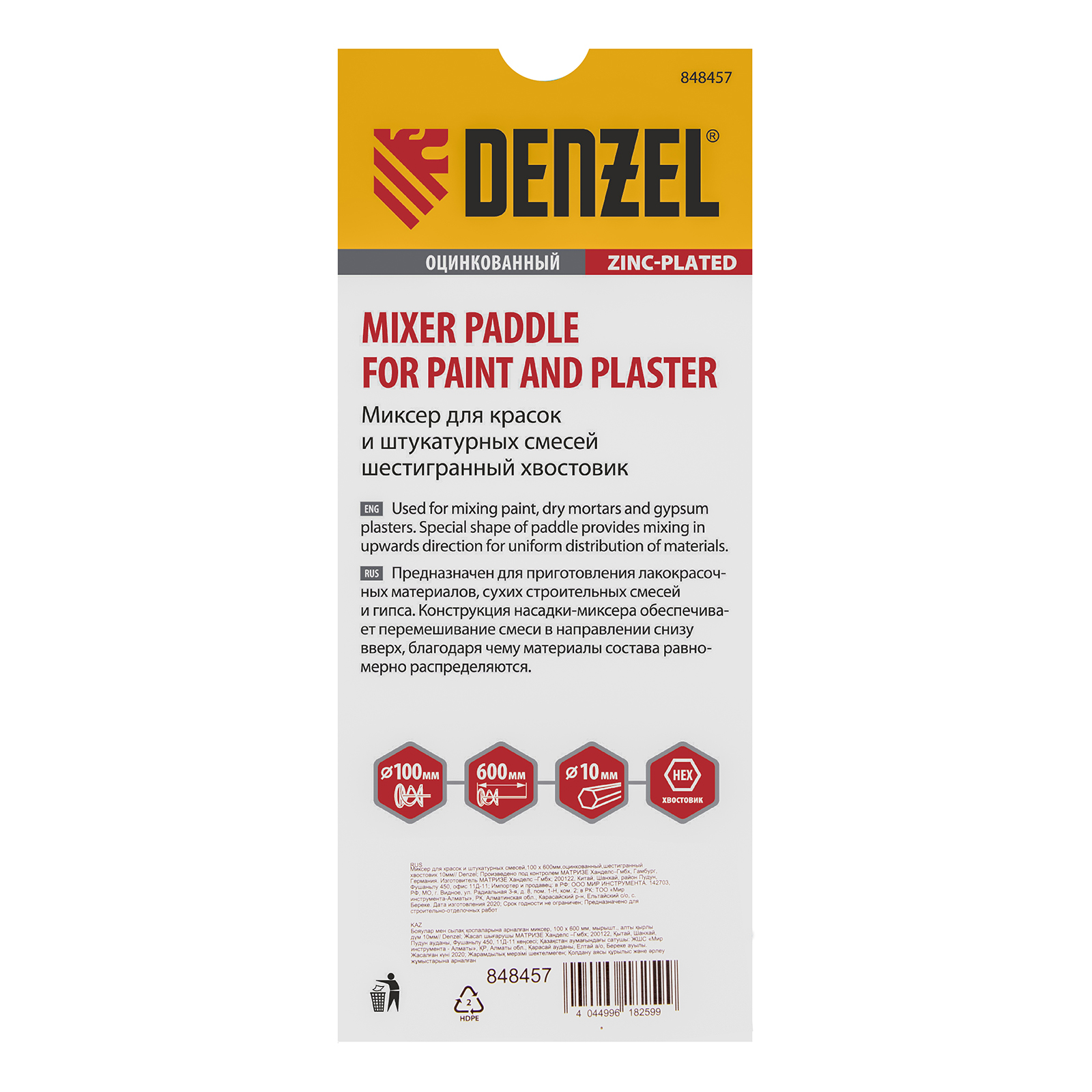Миксер для красок и штукатурных смесей, 100 х 600 мм, оцинкованный, шестигранный хвостовик 10мм Denzel в Москве