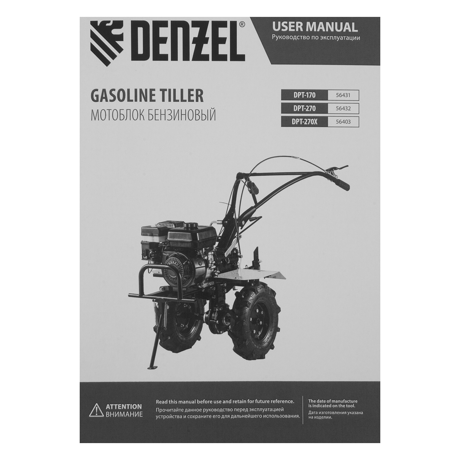 Мотоблок DPT-370X, 7 л.с, дисковое сцепление, ширина 90 см, глубина 35 см, фрез 3 х 4, ВОМ, передачи 3В/1Н Denzel