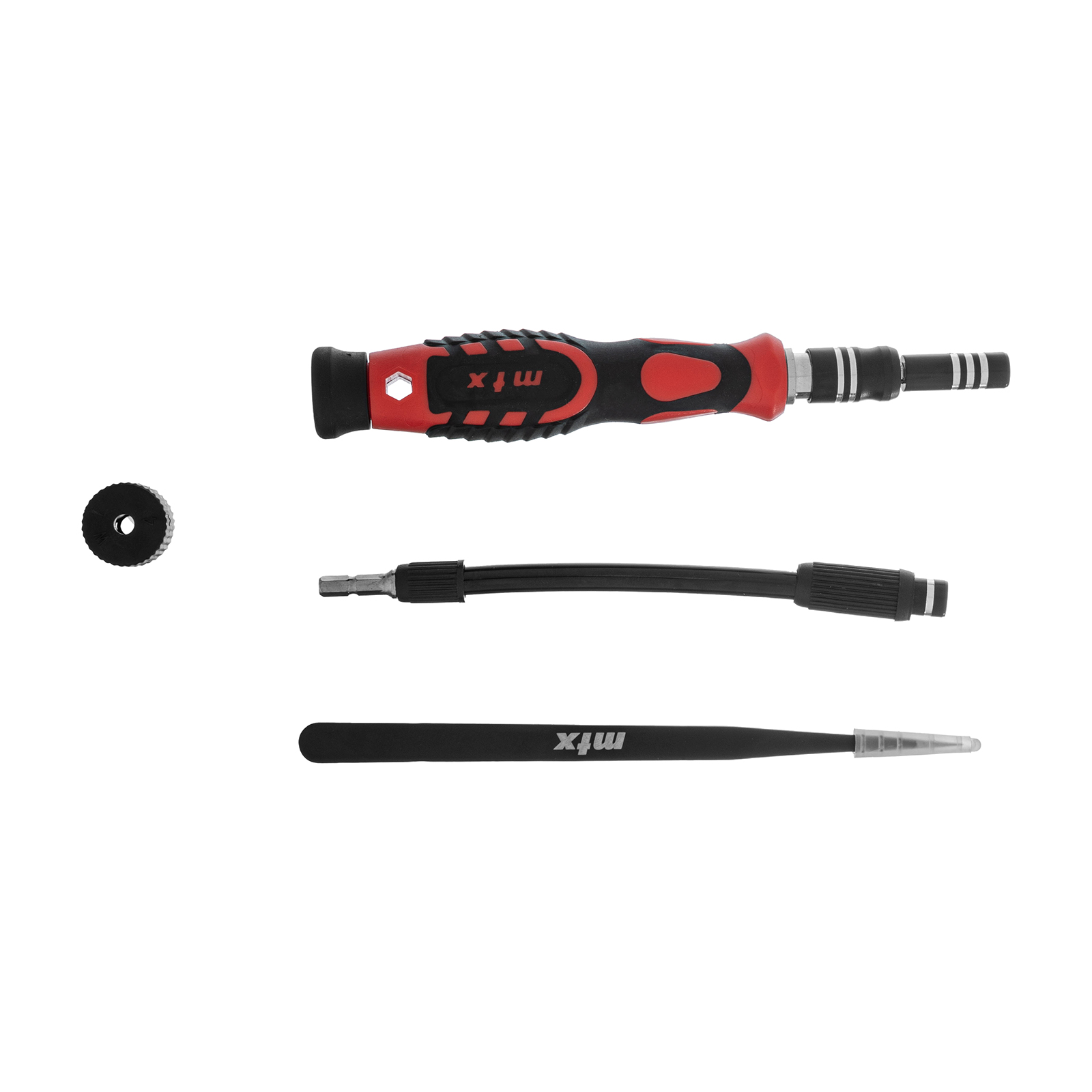 Набор для точных работ MTX 135697 включает в себя 93 биты, 9 торцевых головок, телескопический и гибкий удлинители, намагничиватель-размагничиватель бит, отвертку и пинцет с защитным колпачком. С его помощью можно отремонтировать очки, игрушки, портативную и бытовую технику и т.д. Выдвижной стержень, гибкий удлинитель и пинцет позволяют работать с мелкими деталями в углублениях и труднодоступных местах.