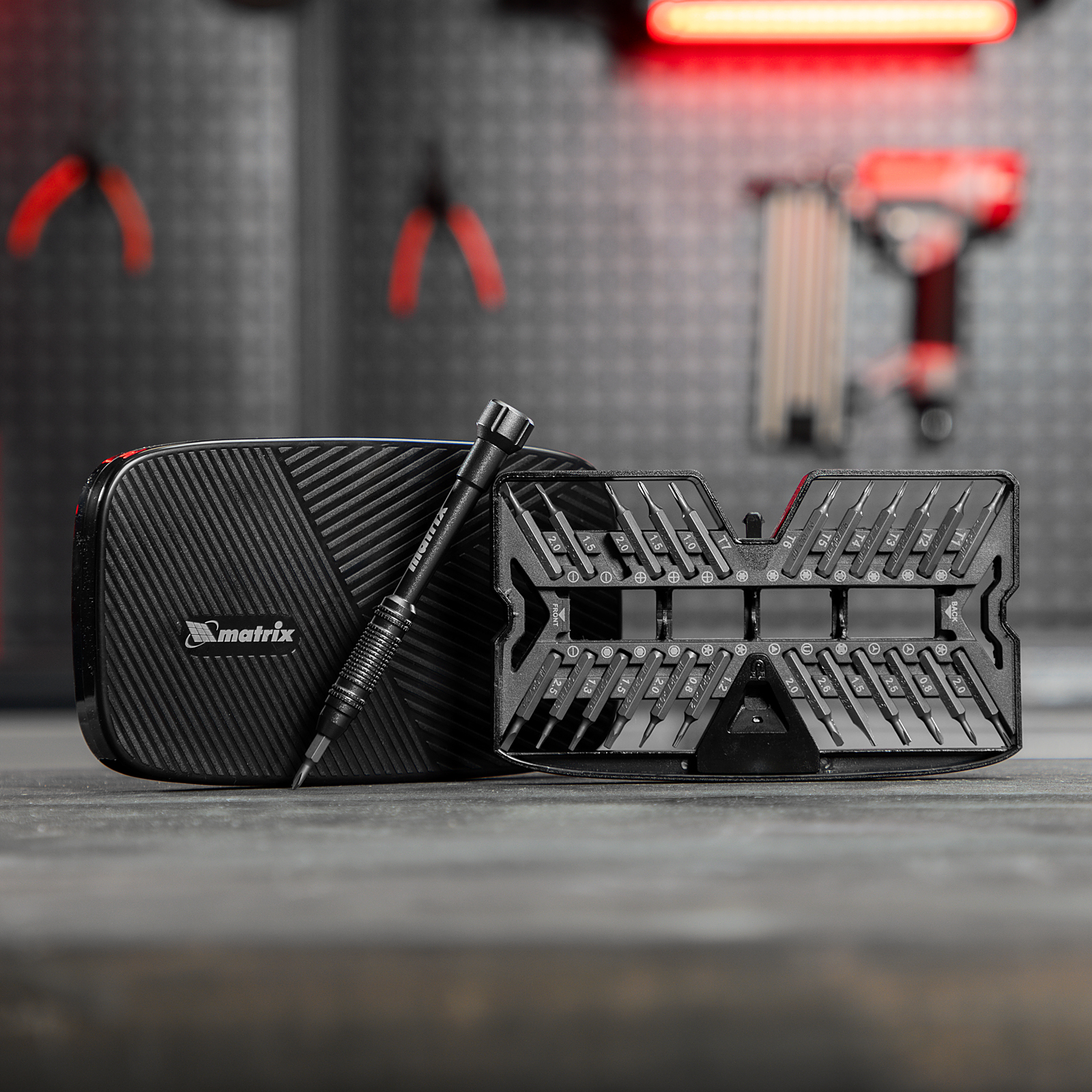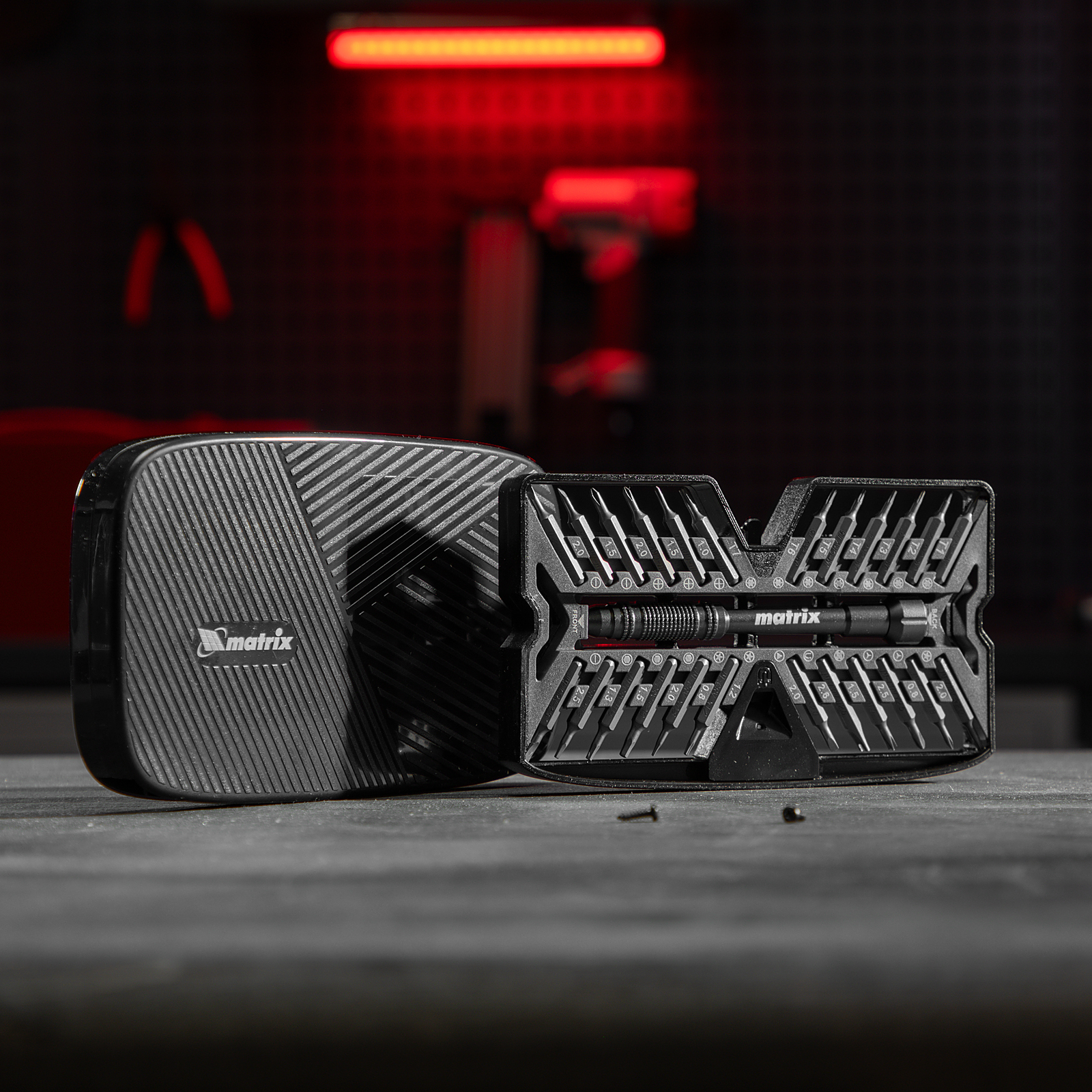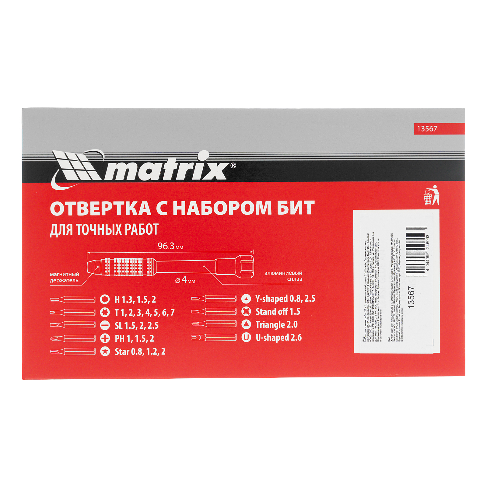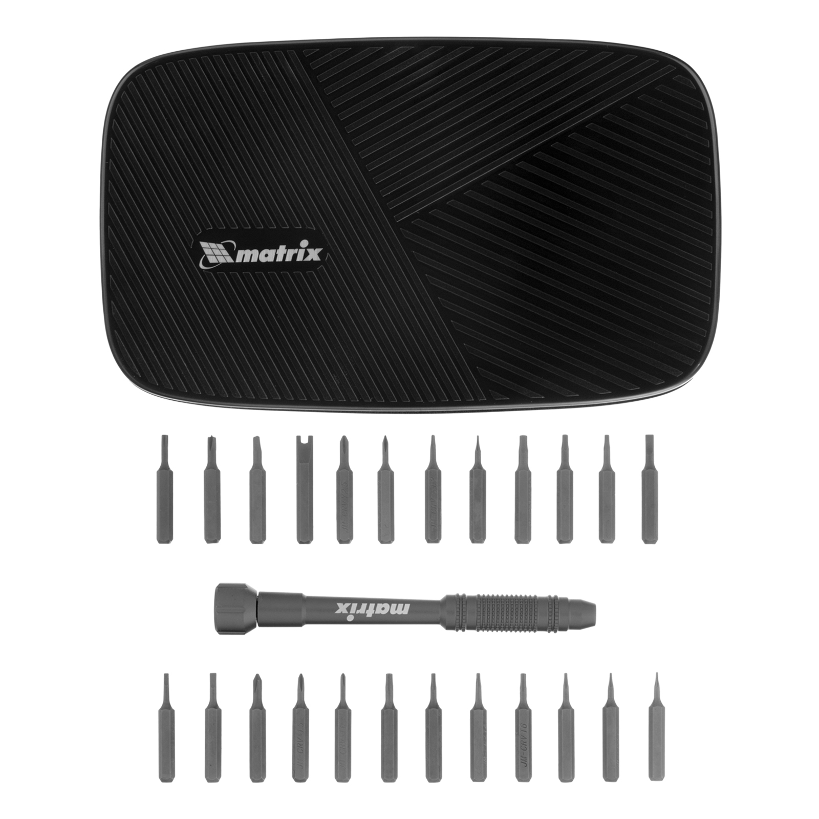 Набор для точных работ 26 в 1 Matrix 13567 содержит 24 биты с наконечниками PH, SL,T, H, Str, Y, St, TR, U, отвертку и пластиковый кейс. С его помощью можно отремонтировать очки, игрушки, портативную и бытовую технику и т.д.