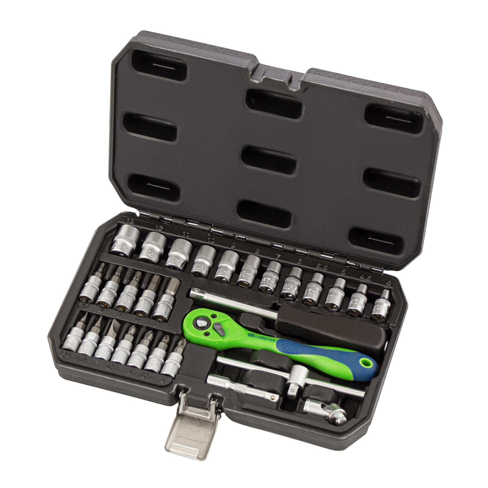 Набор инструментов Сибртех 13523, 1/4 дюйма, в пластиковом кейсе, состоит из 29 предметов, изготовленных из стали CrV-группы и использующихся для работы с резьбовыми соединениями. В комплекте имеются кардан, удлинитель и вороток, упрощающие работу в труднодоступных местах. Набор будет полезен автолюбителям и домашним мастерам.