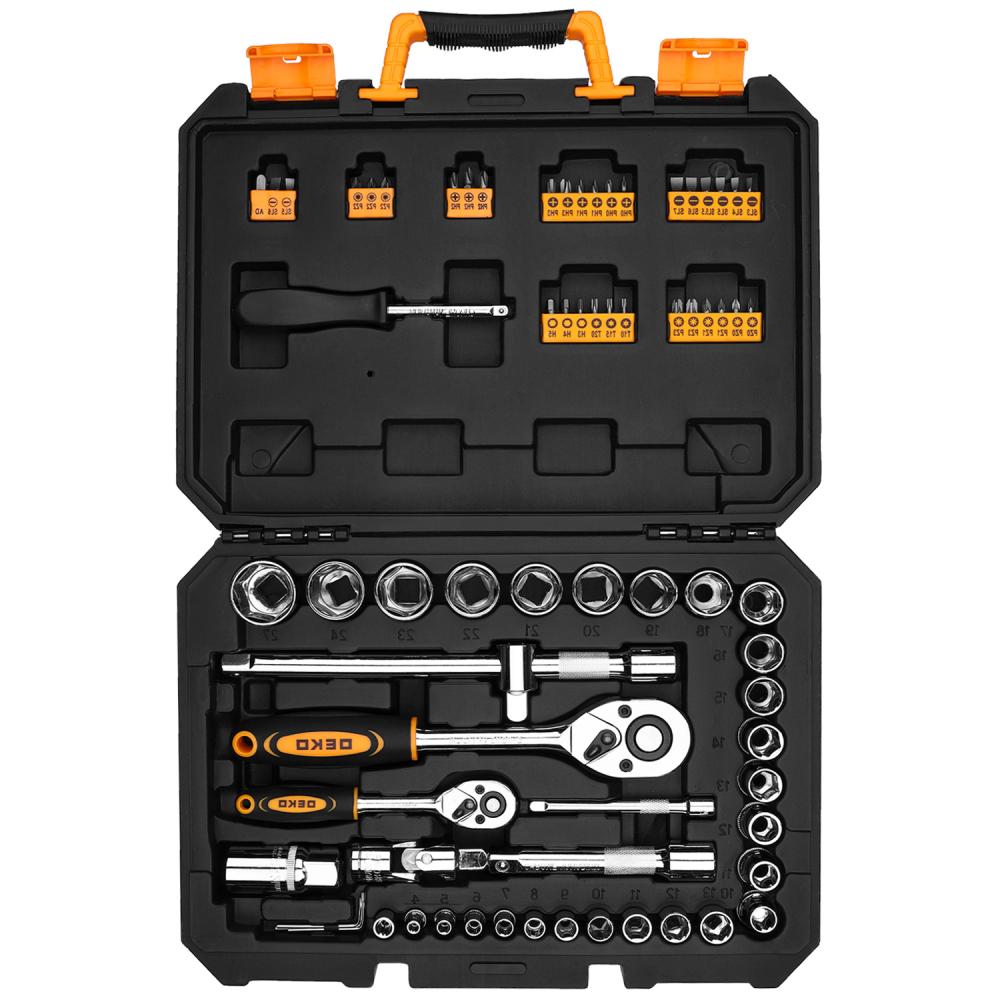 Набор инструментов для авто в кейсе DEKO DKMT72-1 (72 предмета) предназначен для обслуживания автомобилей, а также подойдет для проведения ремонта бытовых конструкций, садовой техники дома и на даче. Все инструменты набора выполнены из стали, что обеспечивает их долгий срок службы.В комплект набора входит:Головки 1/4": 4, 5, 6, 7, 8, 9, 10, 11, 12, 13 мм; 1/2": 10, 11, 12, 13, 14, 15, 16, 17, 18, 19, 20, 21, 22, 23, 24, 27 мм - 26 штБиты 6,35 мм: H: 3, 4, 5; T: 10, 15, 20, A.D; SL: 3, 4, 5, 5/5, 6, 6, 7; PH: 0, 0, 1, 1, 2, 2, 3, 3; PZ: 0, 0, 1, 1, 2, 2, 2, 3, 3 - 33 штОтвертка-держатель 1/4" - 1 штШестигранные ключи: 1.5, 2, 2.5 мм - 3 штУдлинители: 1/4", 1/2" - 2 штУдлинитель с адаптером для головок: 1/2" - 1 штДержатель для бит 1/4" - 1 штКарданный шарнир 1/2"  1 штГоловки свечные: 1/2"х21 мм - 1 штТрещотки: 1/4", 1/2" - 2 шт Руководство по эксплуатации - 1 шт