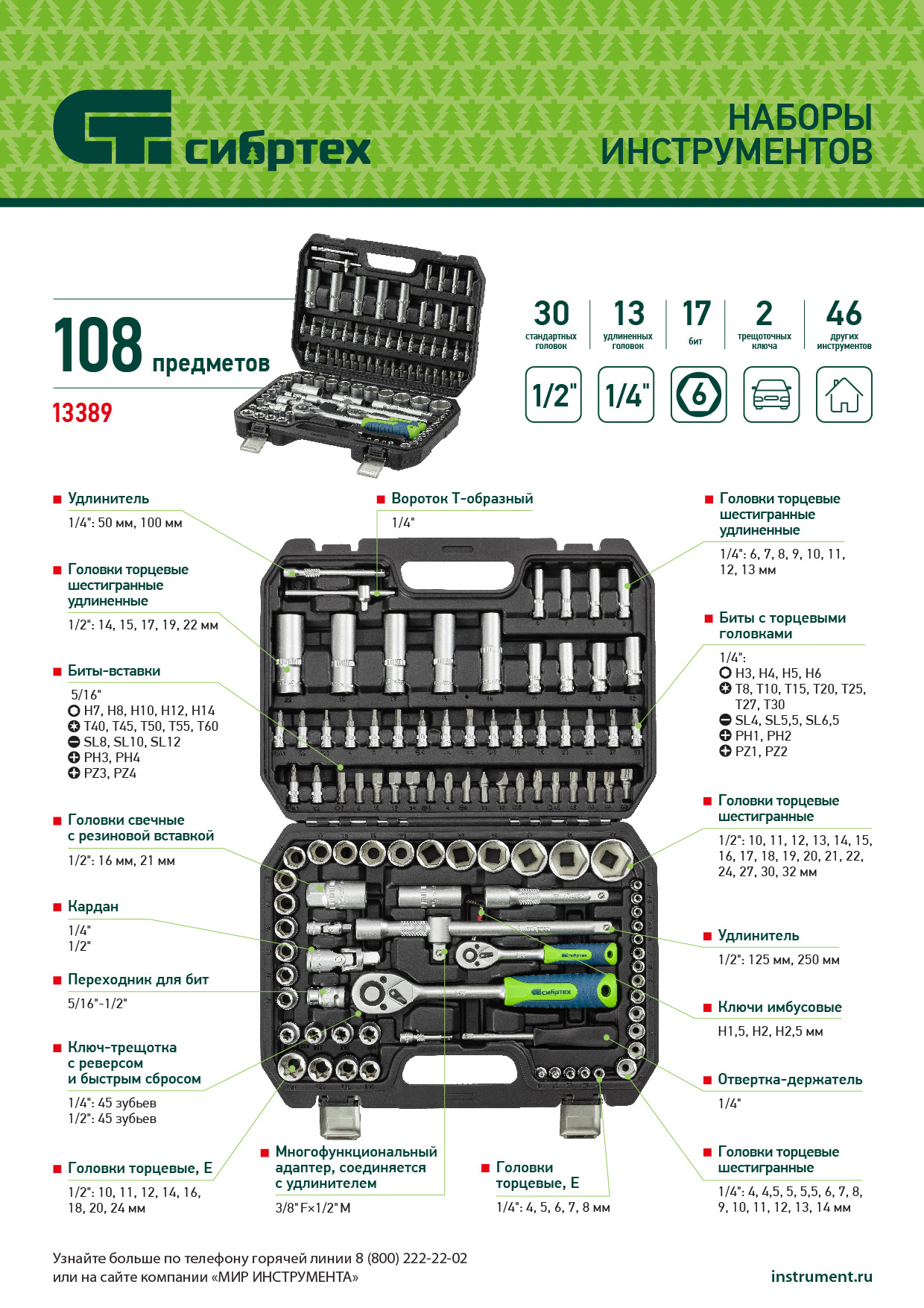 Набор инструментов, 1/2", 1/4", 108 предметов// Сибртех в Москве