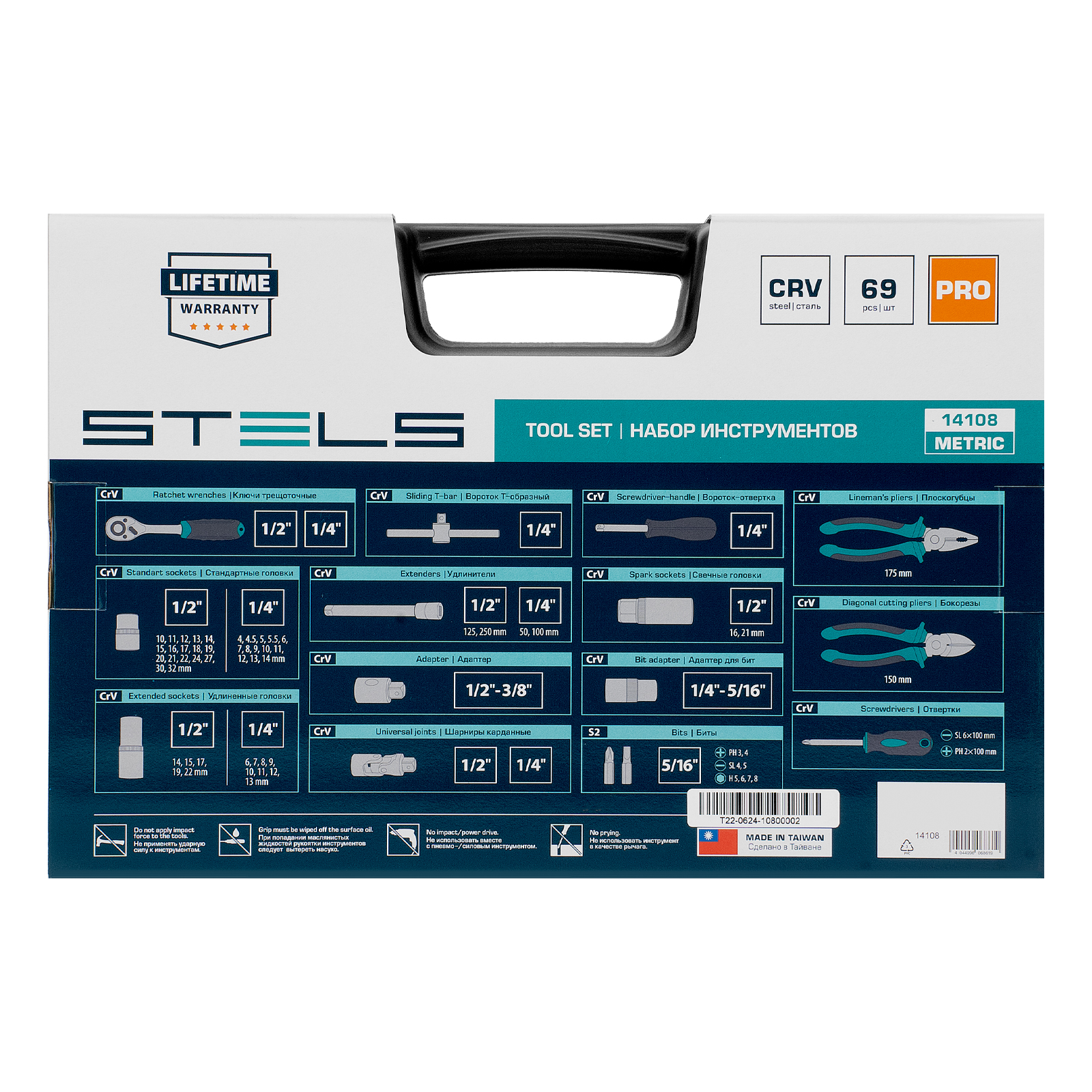Набор инструментов Stels 14108 в ударопрочным пластиковом кейсе состоит из 69 предметов с присоединительными квадратами 1/2″ и 1/4″, из стали CrV и S2, и предназначен для выполнения слесарно-монтажных работ. Включает инструменты и насадки для работы с резьбовыми крепежами, а также удлинители и т-образный вороток, облегчающие работу в труднодоступных местах. Бокорезы и плоскогубцы расширяют возможности использования набора. Набор предназначен для профессионального использования в автомастерской, будет полезен и для решения бытовых задач.