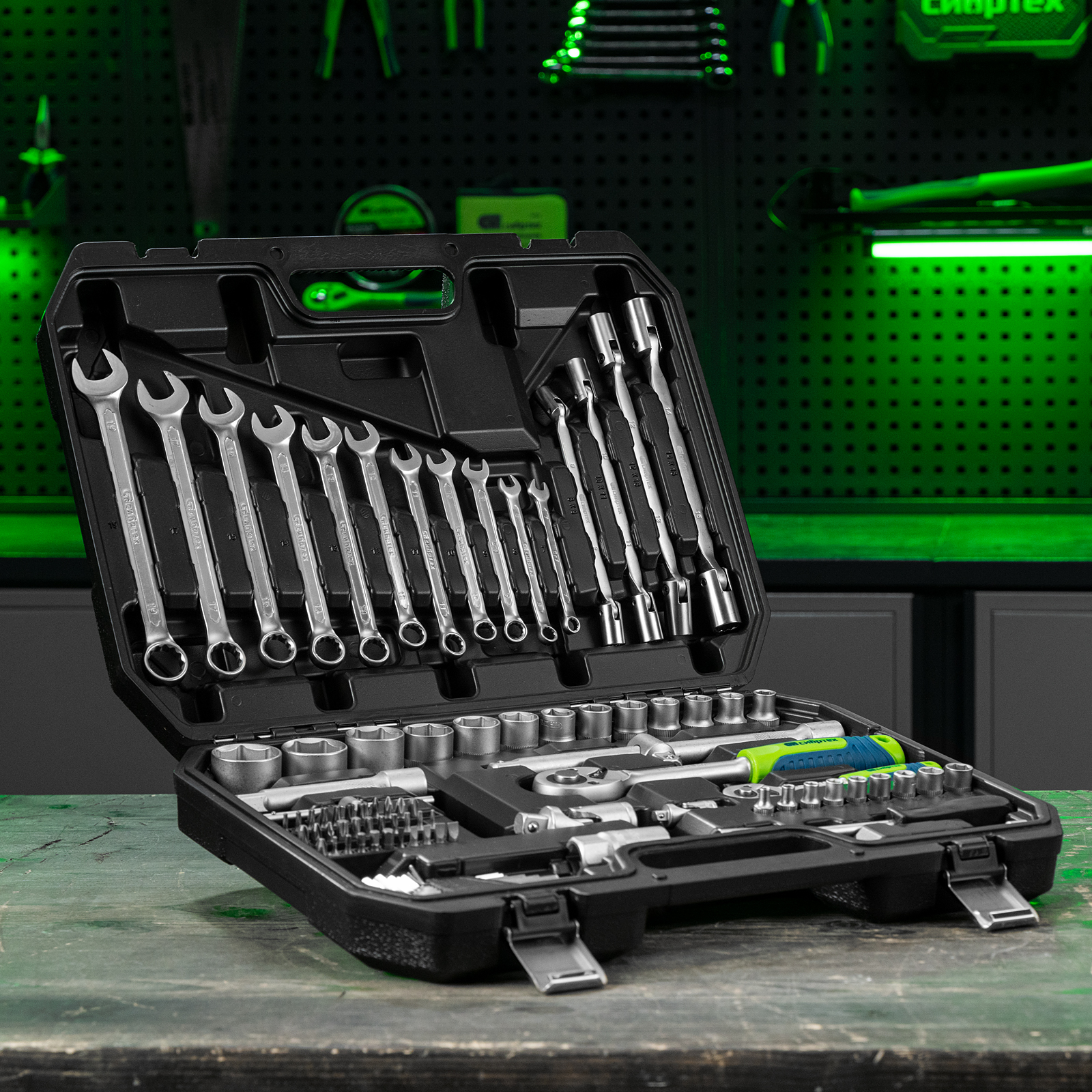 Набор инструментов Сибртех 13396 упакован в пластиковый кейс и состоит из 89 предметов с присоединительным размером 1/2" и 1/4", предназначенных для монтажа и демонтажа резьбового крепежа с разными типами шлицев. В комплект поставки входят карданы, удлинители и шарнирные ключи, облегчающие работу в труднодоступных местах. Набор используется для ремонта автомобилей, а также полезен в быту.