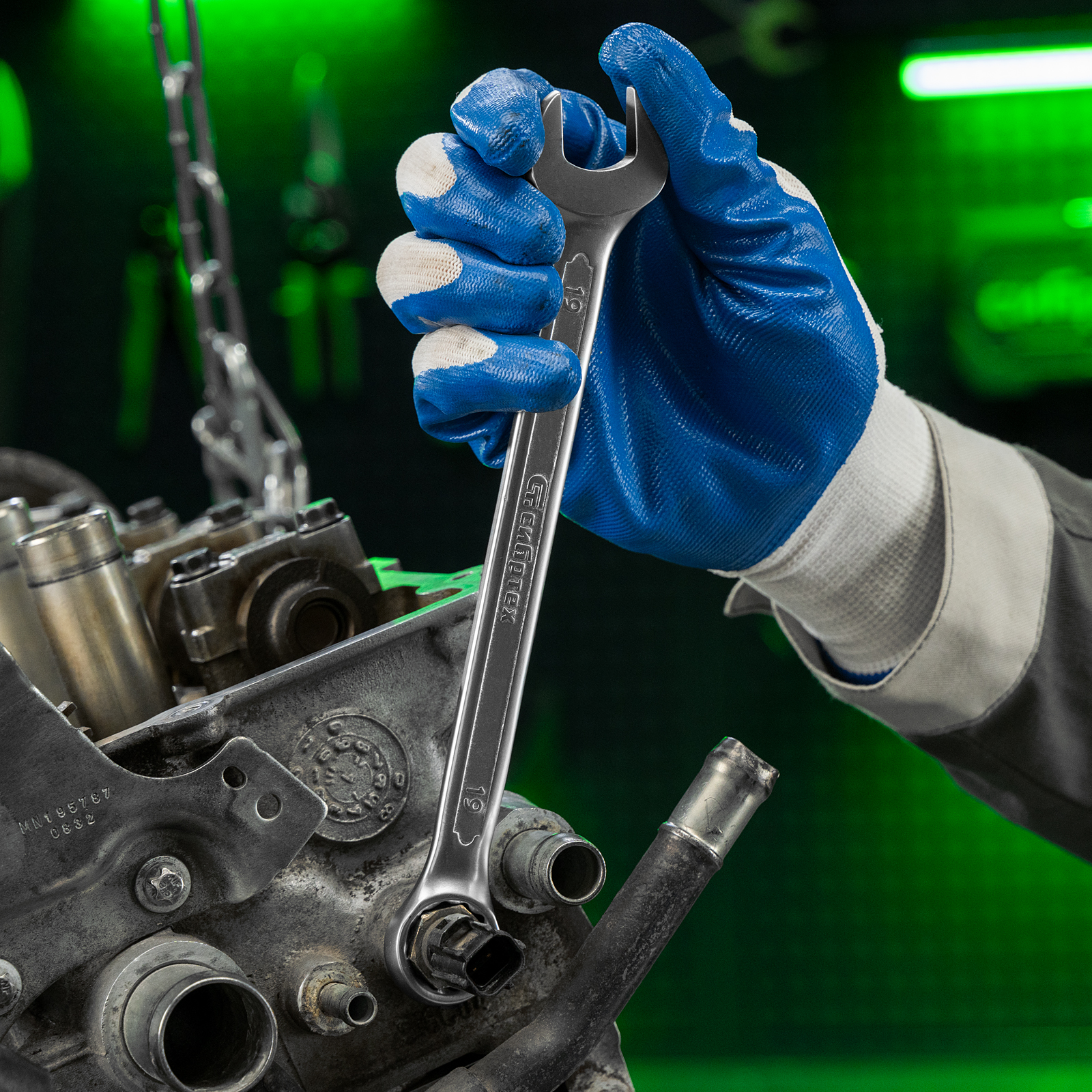 - Комфортная и эффективная работа — ключи-трещотки с 45 зубьями оснащены механизмом быстрого сброса, переключателем реверса с металлическим флажком и двухкомпонентной рукояткой.