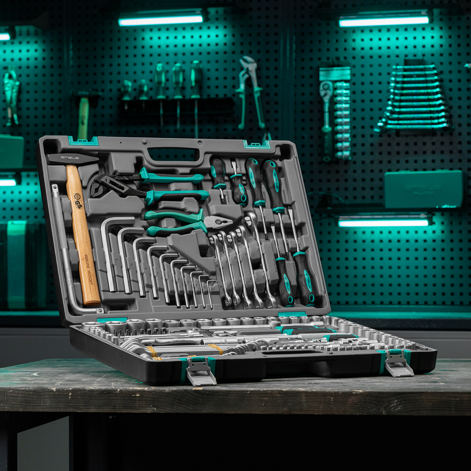 Набор инструментов, 1/2",3/8", 1/4", CrV, пластиковый кейс 142 предмета Stels в Москве