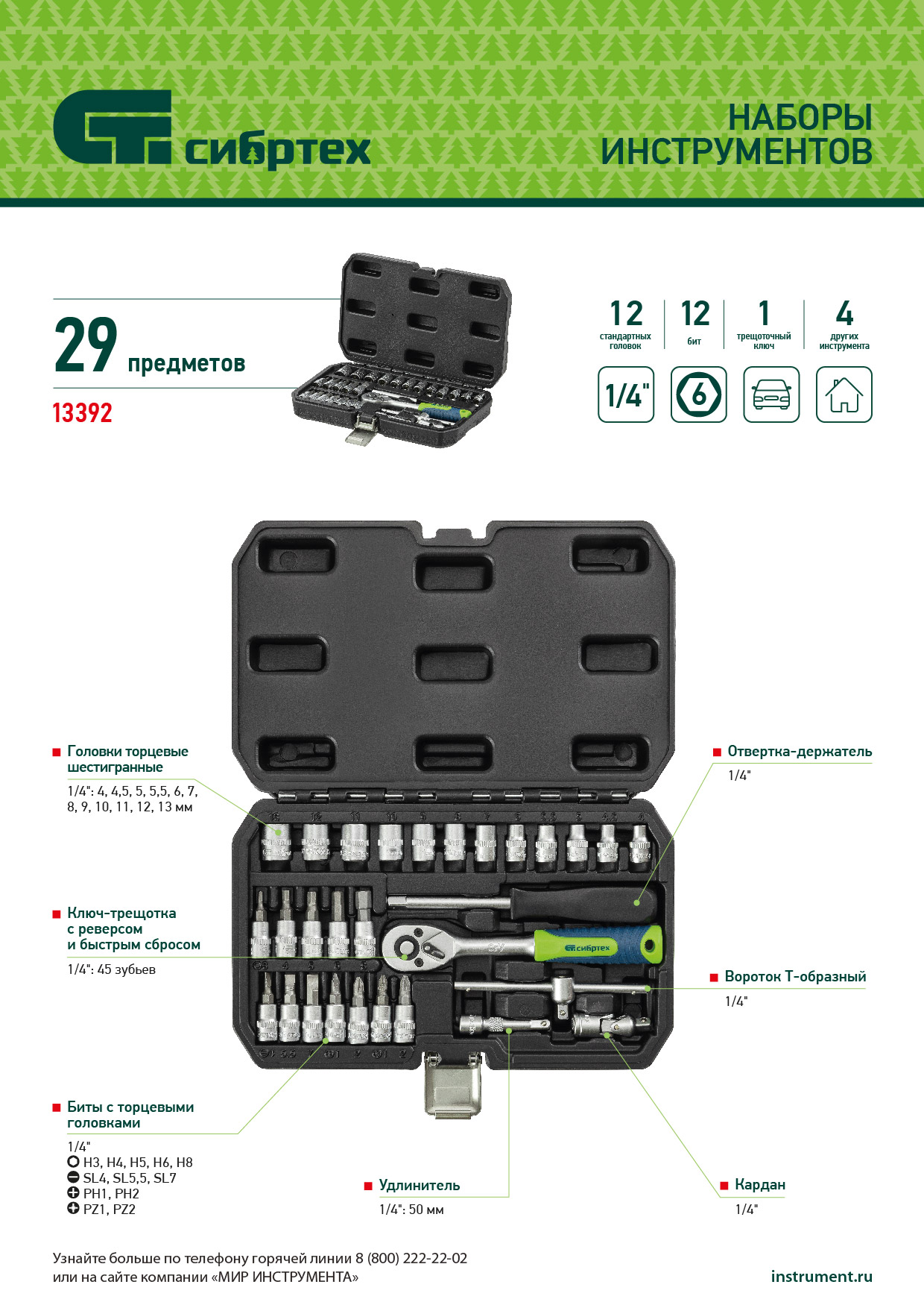Набор инструментов, 1/4", пластиковый кейс, 29 предметов Сибртех в Москве