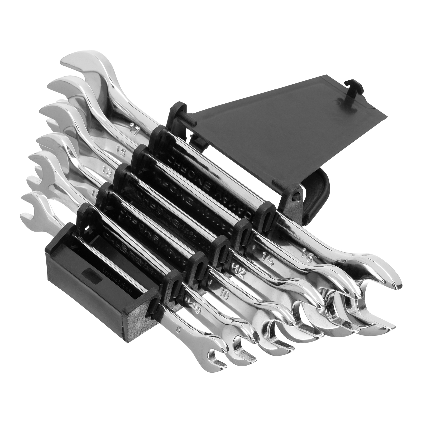 Набор Matrix Elliptical 15236 включает в себя 6 рожковых ключей из стали CrV с зеркальным хромированием и предназначен для закручивания и откручивания резьбовых соединений с шестигранным профилем и размером головки от 6 до 17 мм. Ключи удобны для манипуляций в ограниченном пространстве, т. к. у каждого из них губки расположены под углом к рукоятке. Набор будет полезен при проведении монтажных, сантехнических работ, для ремонта автомобилей или бытовой техники, также пригодится в быту.