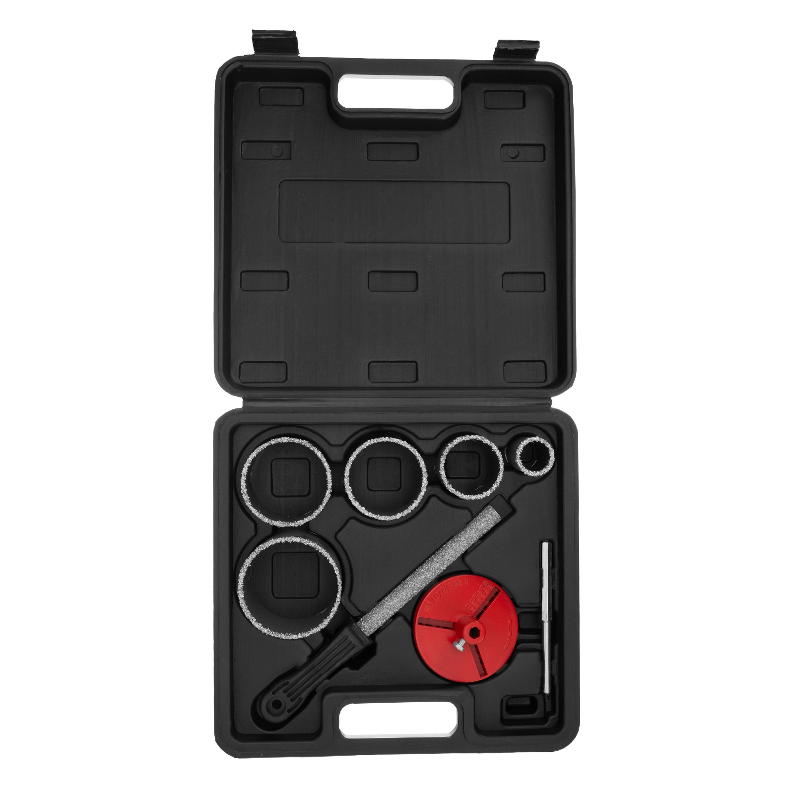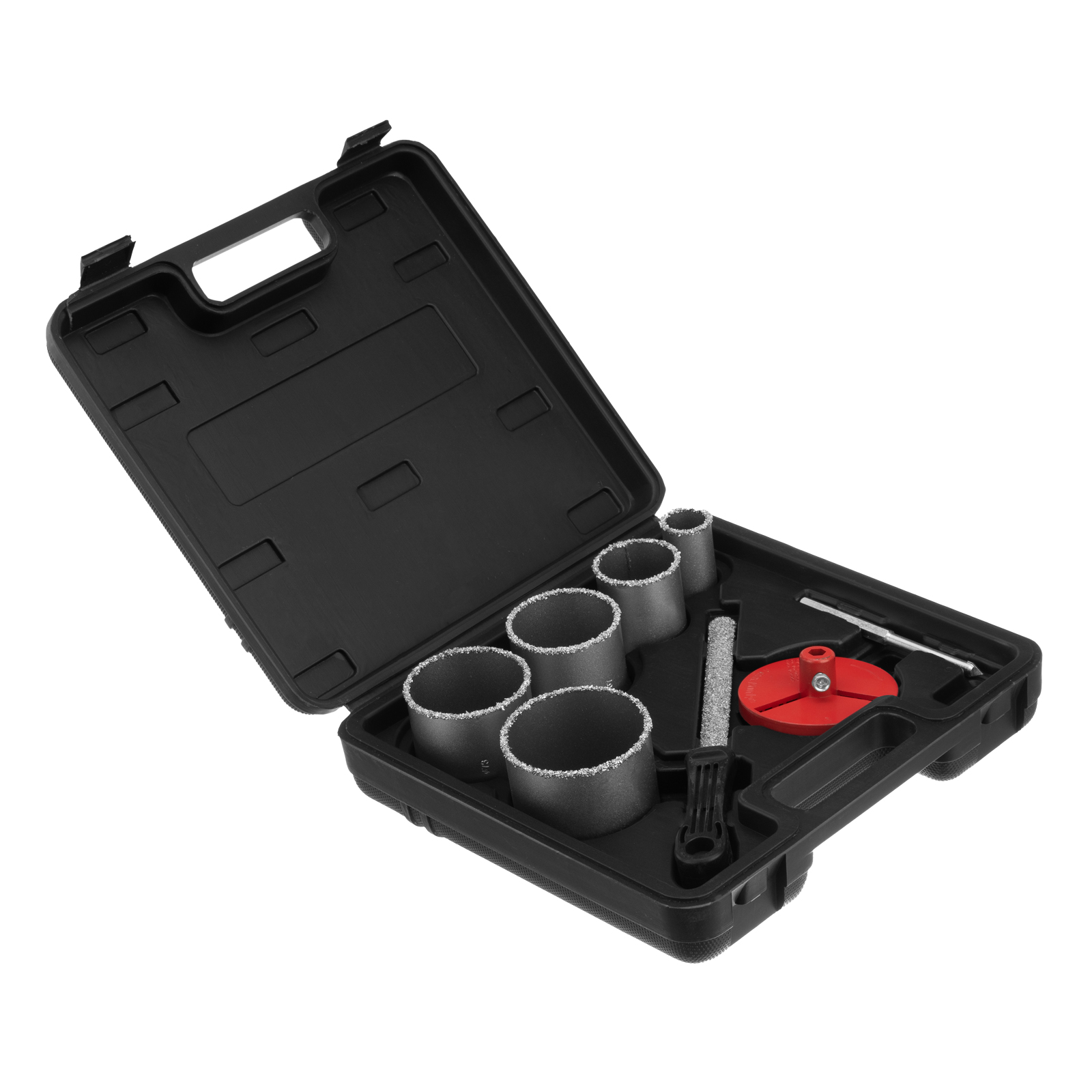 - Легкий поиск нужной оснастки — в набор входят коронки диаметром 33, 53, 67, 73, 83 мм с четкой маркировкой размера на корпусе.