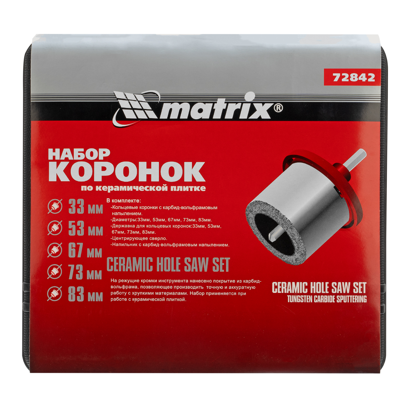 Набор коронок по керамической плитке, 33-53-67-73-83 мм, напил, в пластиковом боксе, шестигранный хвостовик Matrix в Москве