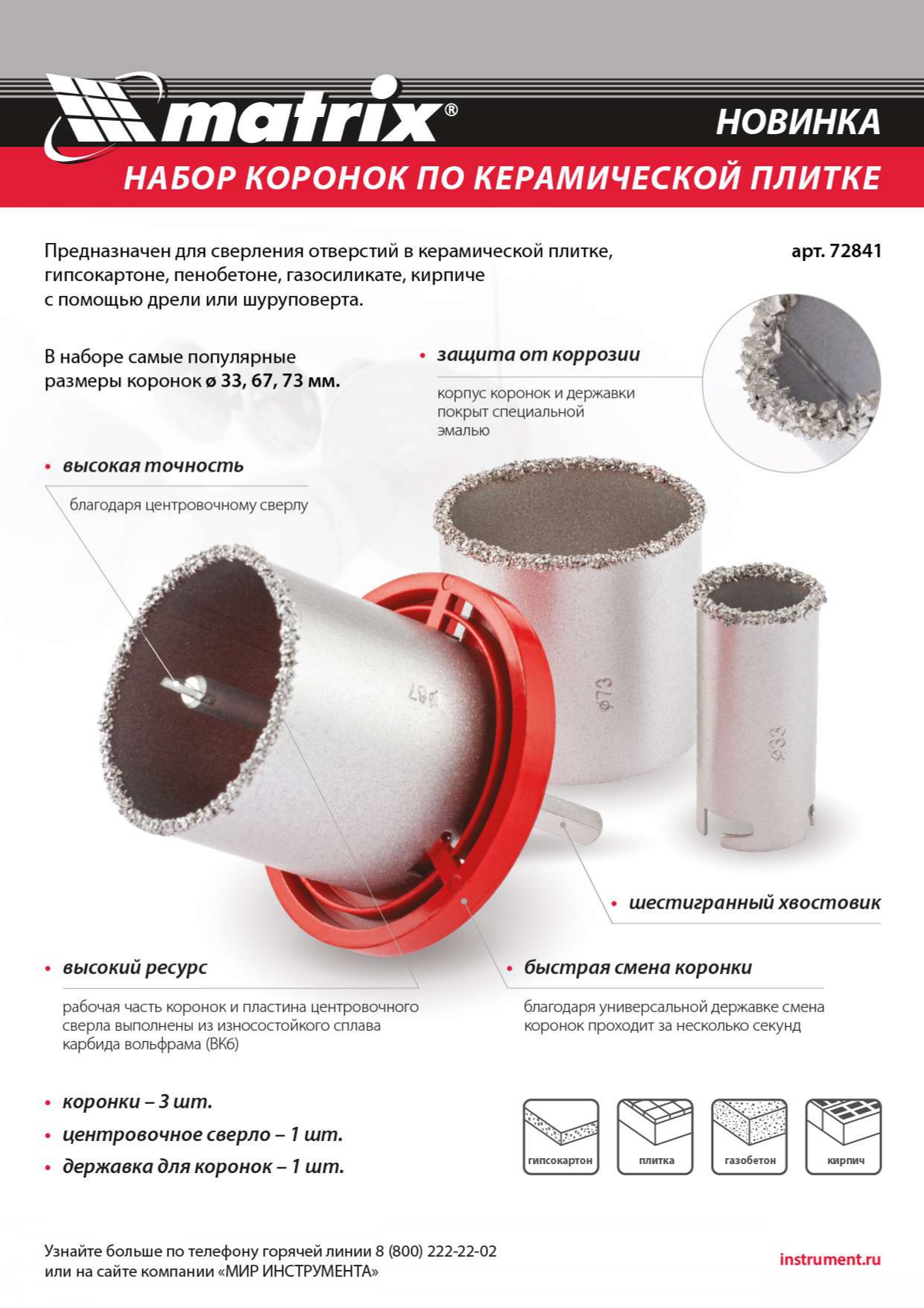 Набор коронок по керамической плитке, 33-67-73 мм, шестигранный хвостовик Matrix в Москве