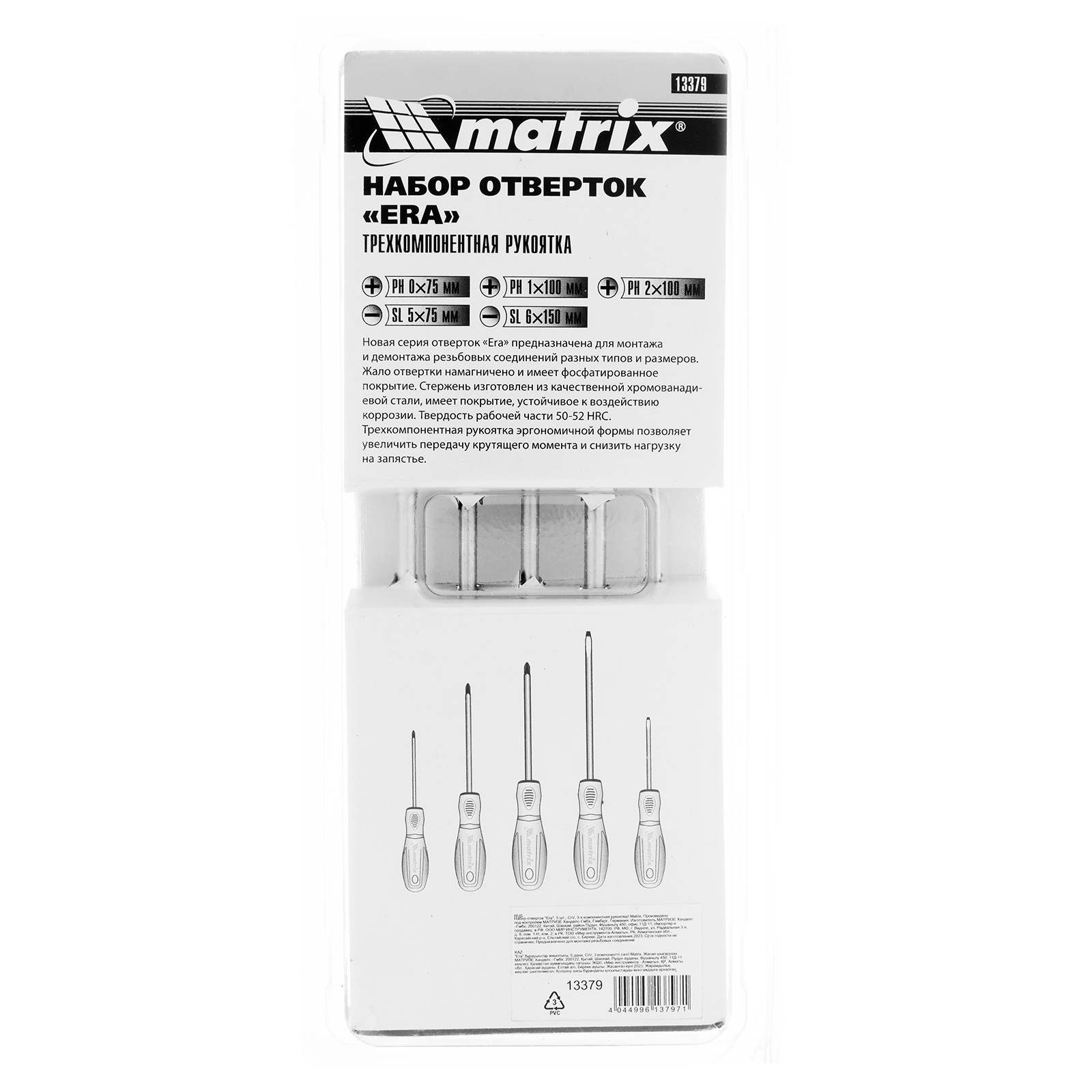 Набор отверток Matrix «Era» 13379 с трехкомпонентными рукоятками, из стали CrV, состоит из 5 инструментов и используется для работы с резьбовыми соединениями. Отвертки подходят для шлицев PH и SL. Благодаря намагниченным наконечникам не нужно придерживать крепеж рукой. Набор рекомендован для профессионального применения и пригодится во время сборки мебели, ремонта бытовой и оргтехники.