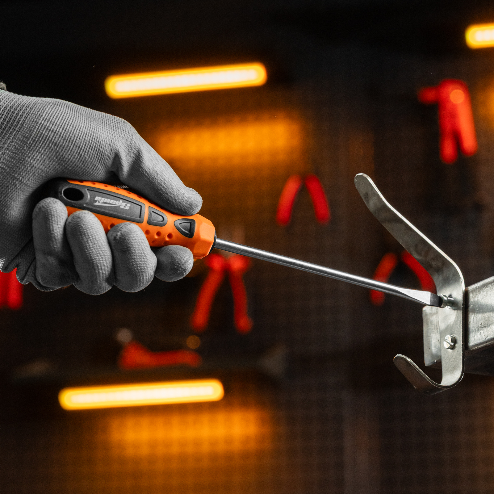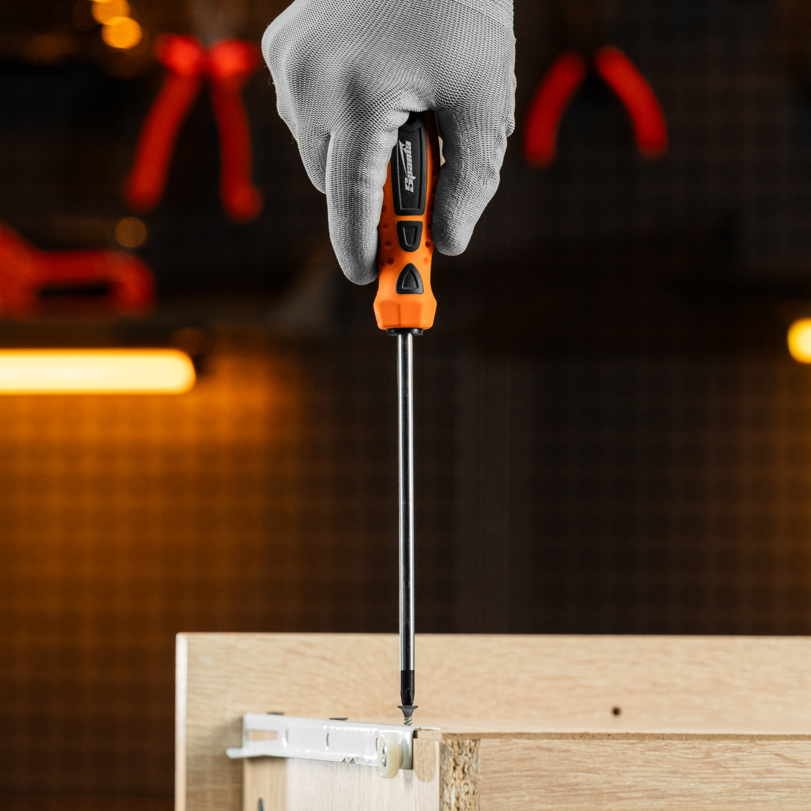 - Подвесная полка обеспечивает удобное хранение отверток, также на рукоятке каждого инструмента предусмотрено отверстие для подвесного хранения.