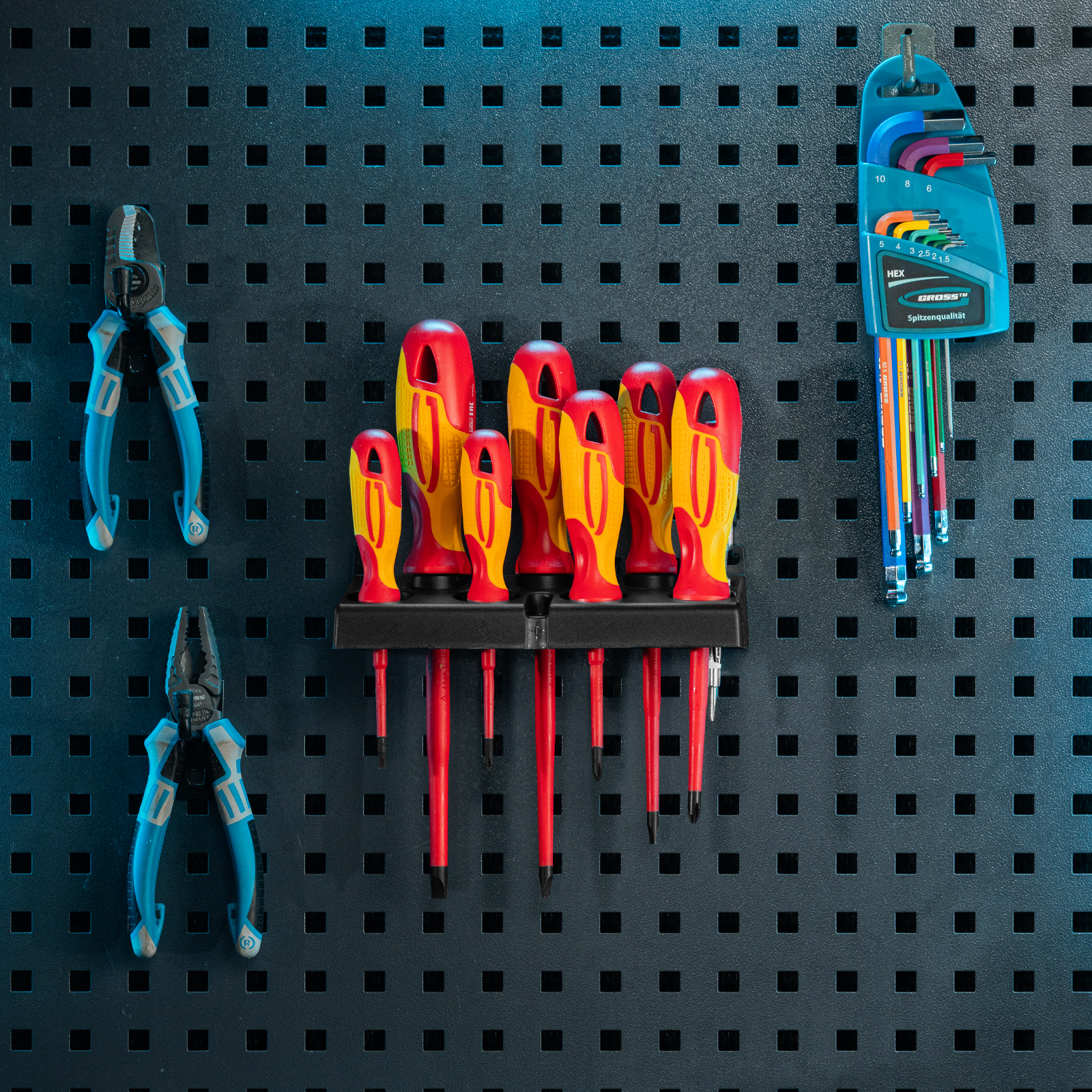- Рукоятки отверток и полка-держатель имеют отверстия для удобного хранения набора и отверток в подвешенном виде.