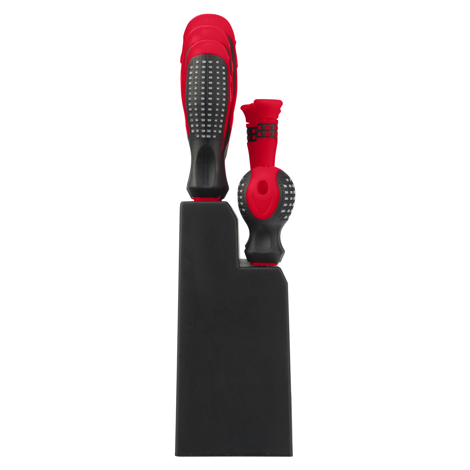 - Удобное хранение — отвертки размещаются на пластиковой подставке, которую можно поставить на стол или повесить на стену.