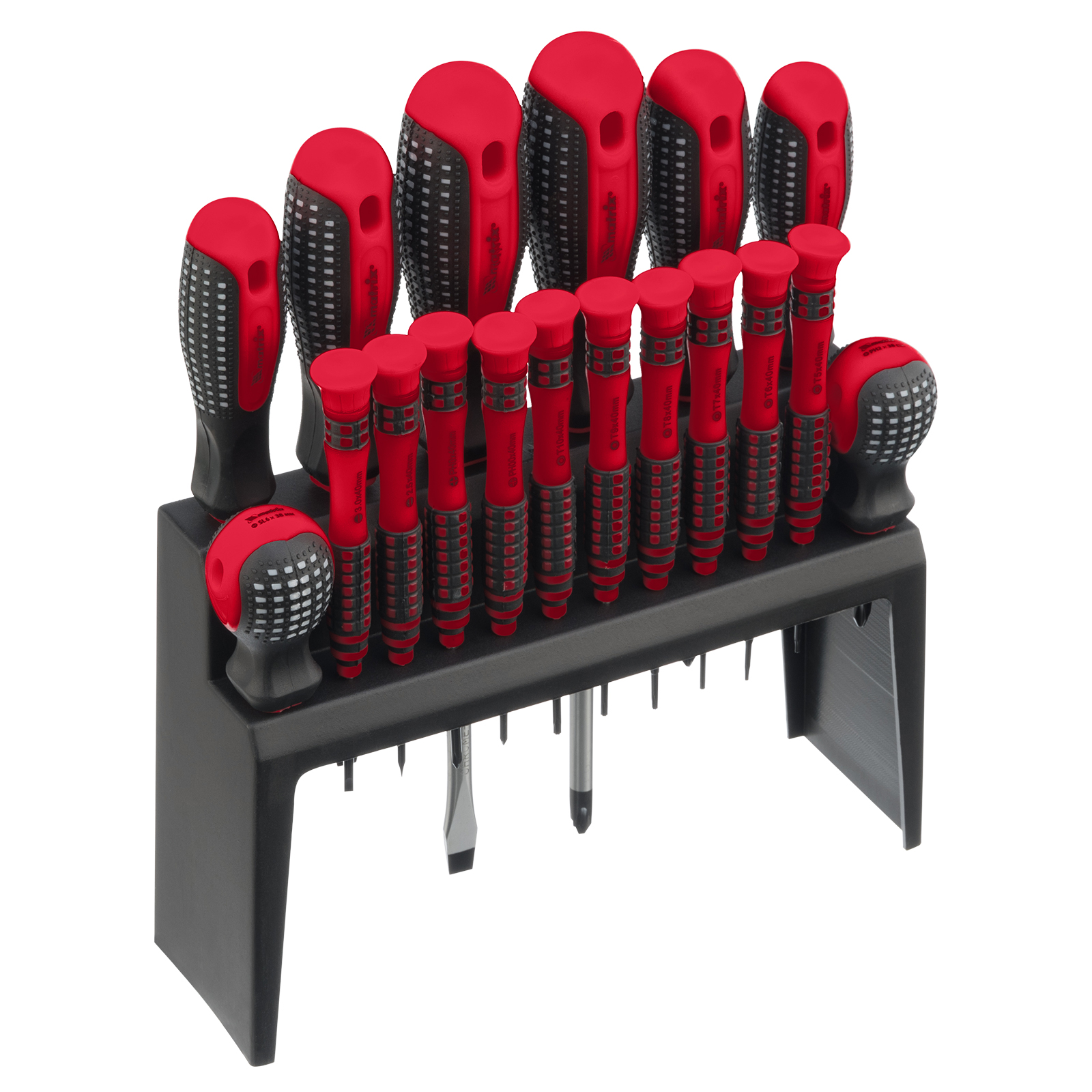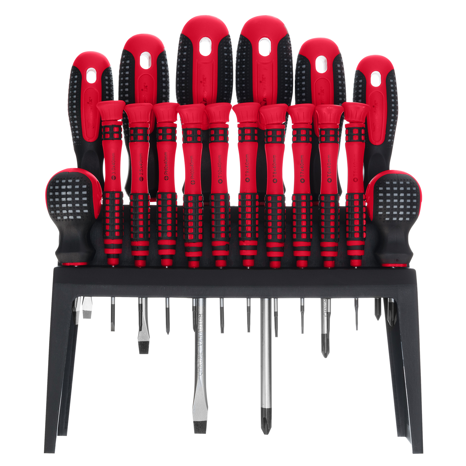 Отвертки стандартные: РН1х75 мм, РН2х38 мм, РН2х100 мм, РН3х150 мм, SL5x75 мм, SL6x38 мм, SL6x100 мм, SL8x150 мм - 8 штОтвертки для точных работ, длина стержня 40 мм: РН00, РН0, SL25, SL3, T5, T6, T7, T8, T9, T10 - 10 штПодставка для отверток - 1 шт |