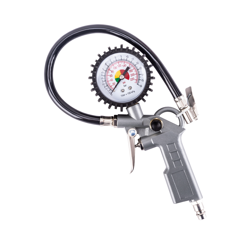 4. Пистолет для подкачки шин с манометром 60 мм -  материал корпуса алюминий, шланг с прищепкой 30 см, макс. давление 12 бар, cоединение Rapid M ("папа")