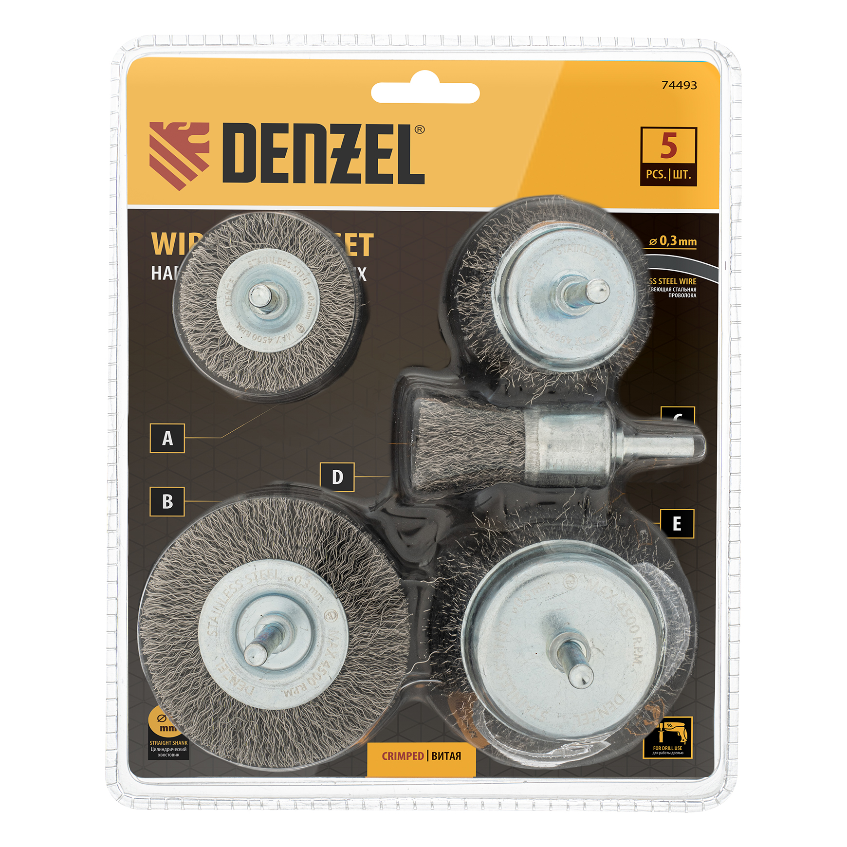 Набор щеток для дрели, 2 Плоские 50-75мм, 3 Чашки 25-50-75мм, шпилька, нерж.вит. проволока Denzel в Москве