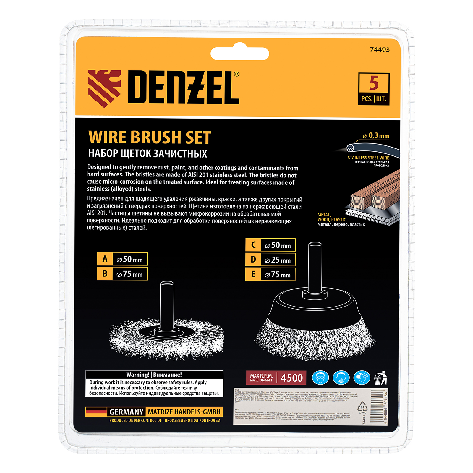 Набор щеток для дрели Denzel 74493 со шпилькой и щетиной из нержавеющей витой проволоки включает в себя 2 плоские насадки диаметром 50-75 мм и 3 «Чашки» диаметром 25-50-75 мм. Набор используется для щадящей обработки твердых поверхностей: металла, стали (в том числе нержавеющей), древесины, пластика, позволяет удалять старые лакокрасочные покрытия, ржавчину и загрязнения. Щетки в форме чашки оптимальны для обработки плоских поверхностей большой площади, плоская насадка удобна для зачистки пазов, изгибов и углов.