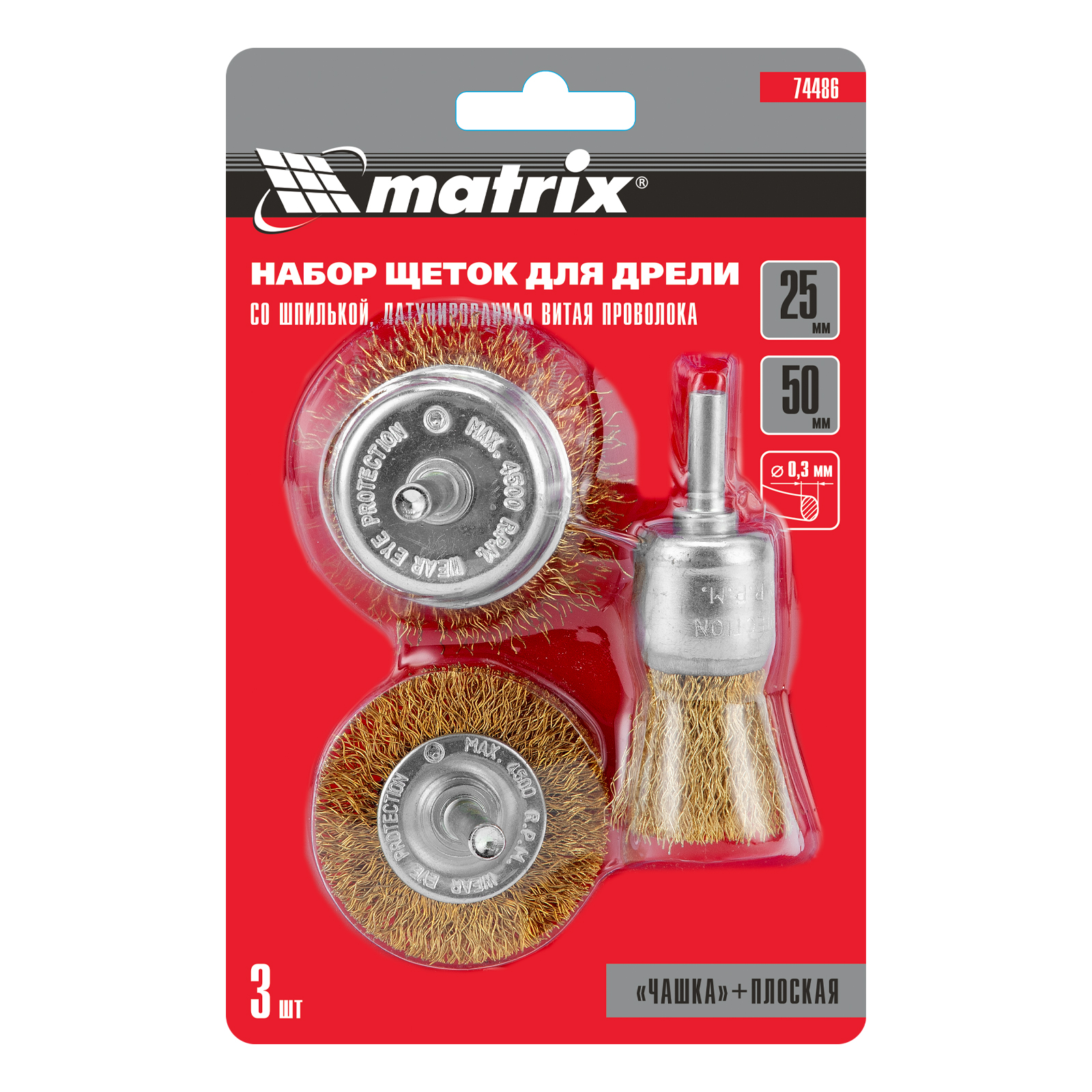 Набор щеток для дрели, 3 шт, 1 плоская, 50 мм, 2 "чашки", 25-50 мм, со шпильками Matrix в Москве