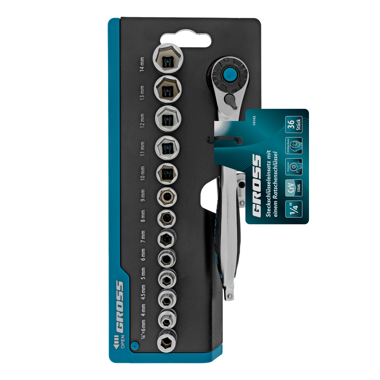 Набор Gross 14142 включает в себя 36 предметов из стали с посадочным квадратом 1/4″: 12 торцевых головок, трещотку со 120 зубьями, удлинитель 100 мм, шарнир, адаптер и 20 бит. Применяется для монтажа и демонтажа резьбовых соединений при проведении технического обслуживания авто или для бытовых ремонтных работ. Набор подходит не только для самостоятельного использования в гараже и дома, но и для профессиональной эксплуатации на станциях техобслуживания.