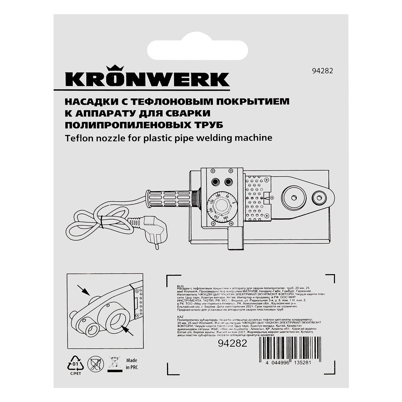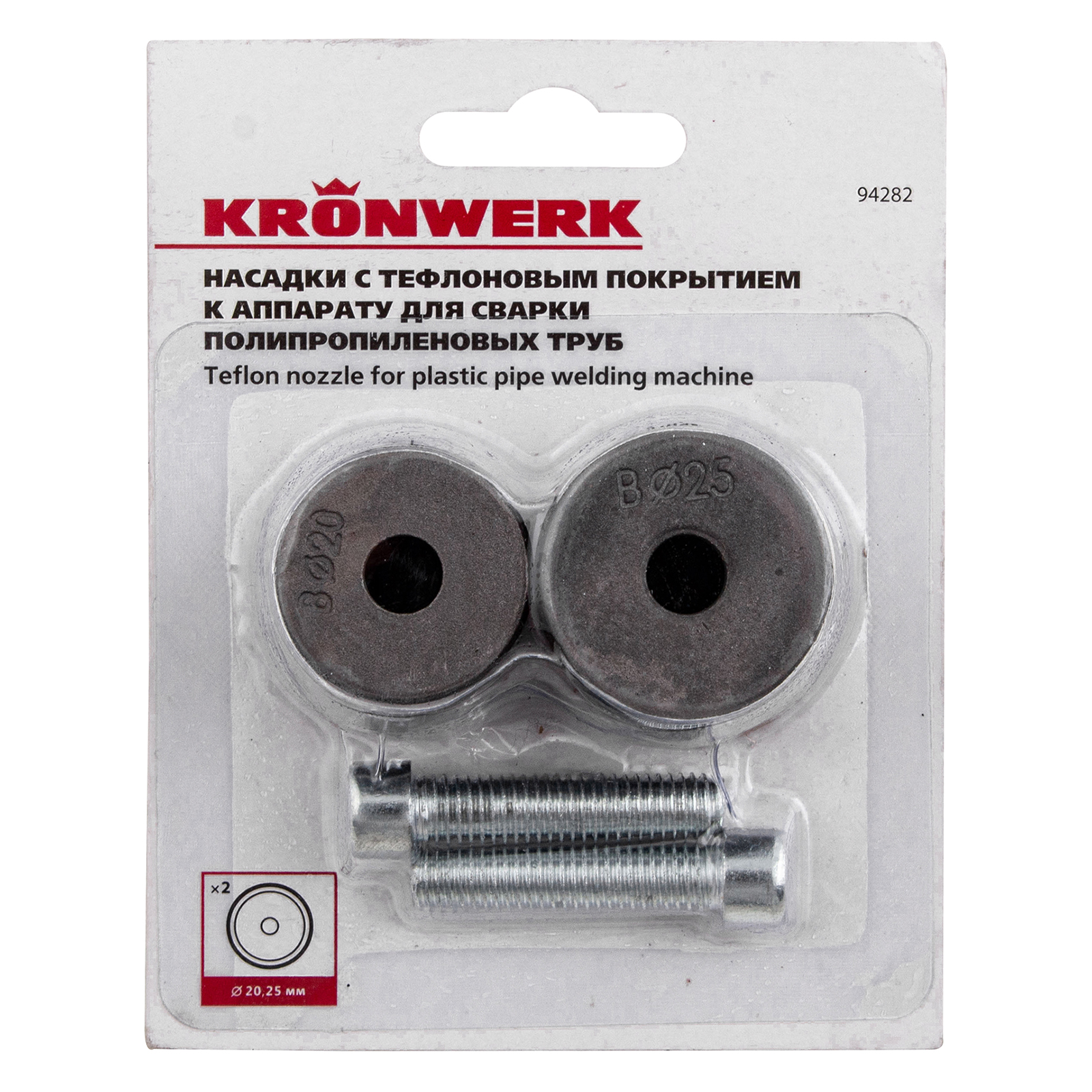Насадки с тефлоновым покрытием Kronwerk 94282 диаметром 20 и 25 мм подходят к любому аппарату для сварки полипропиленовых труб. Каждая насадка состоит из 2 частей: одна для трубы и одна для фитинга. Набор пригодится для монтажа и ремонта систем водопровода.