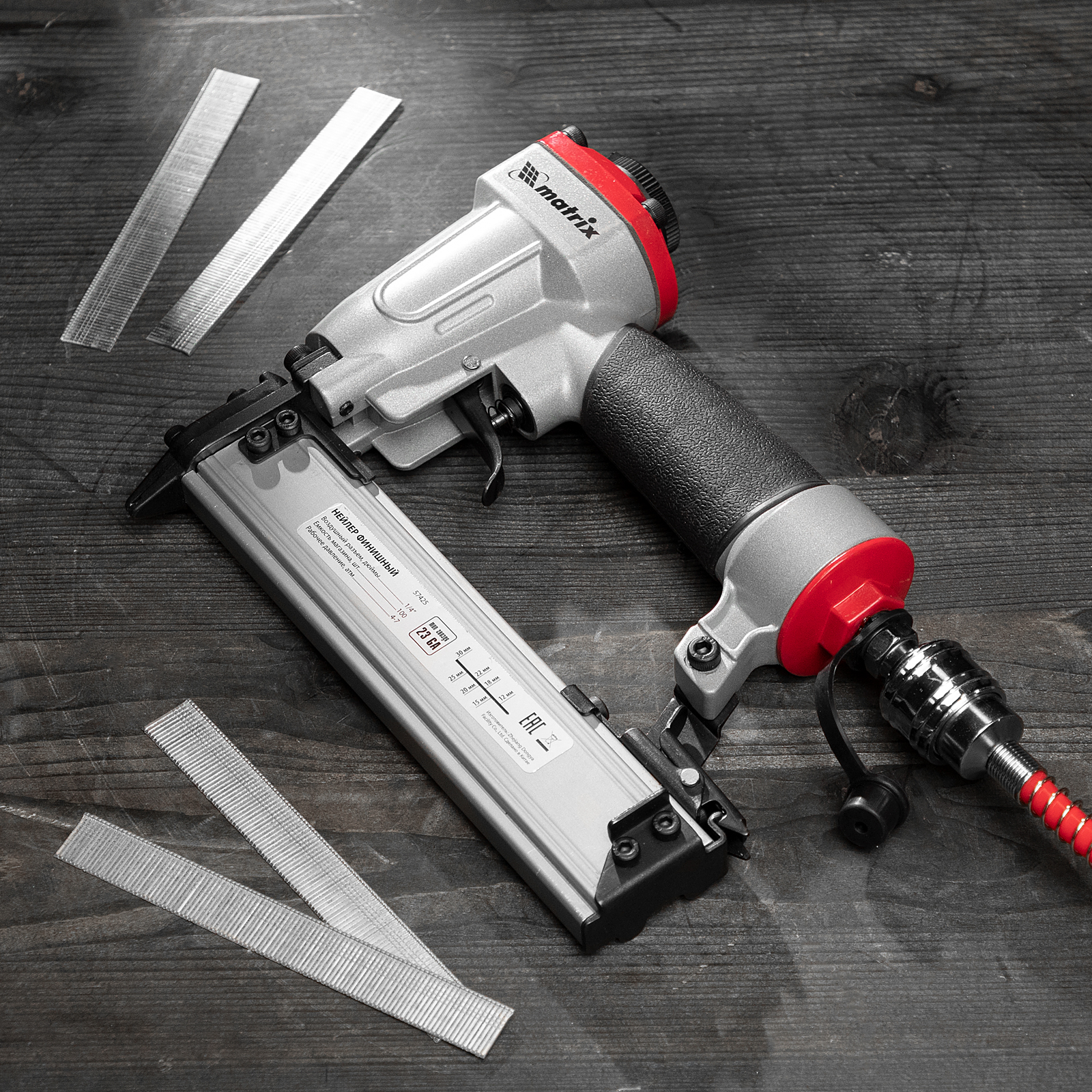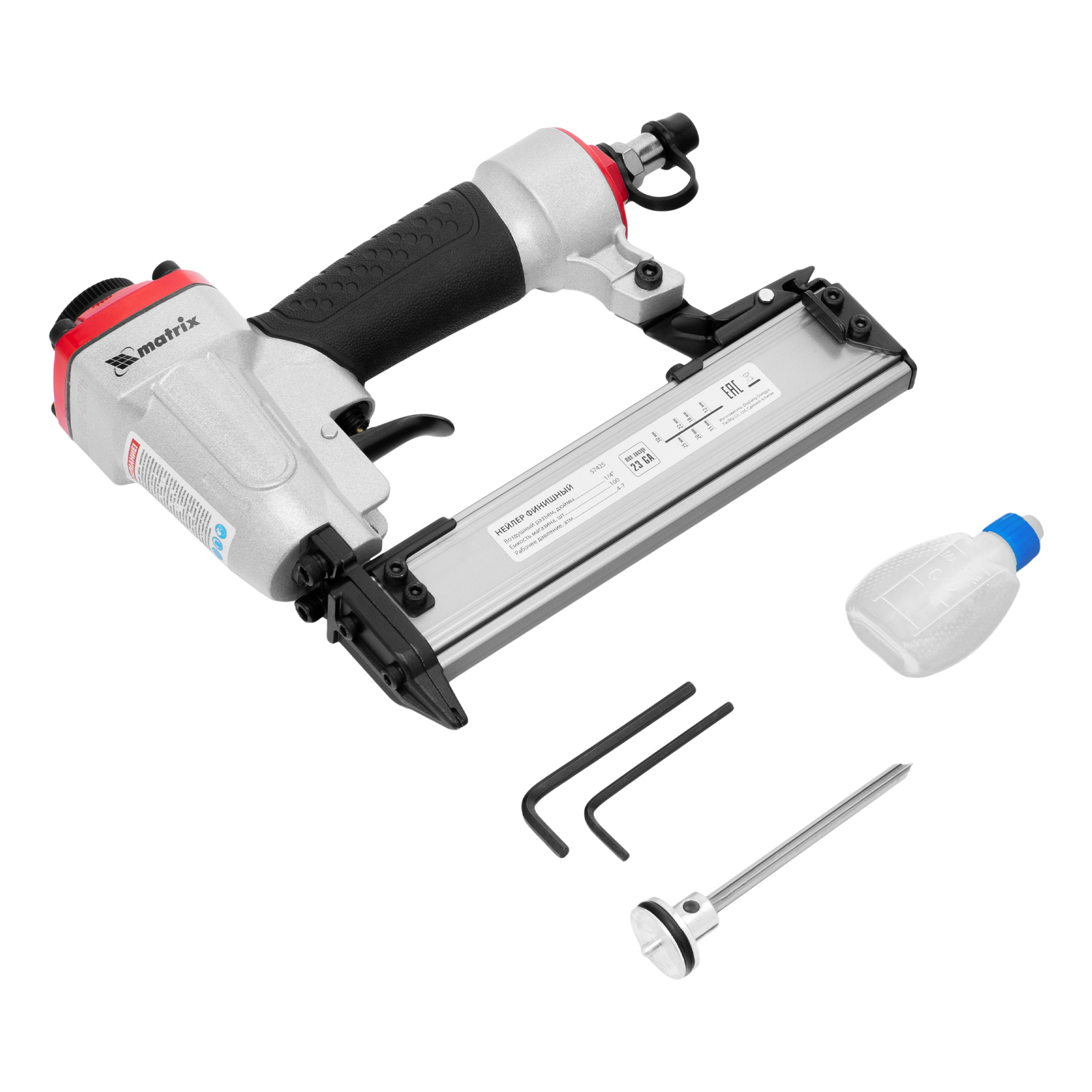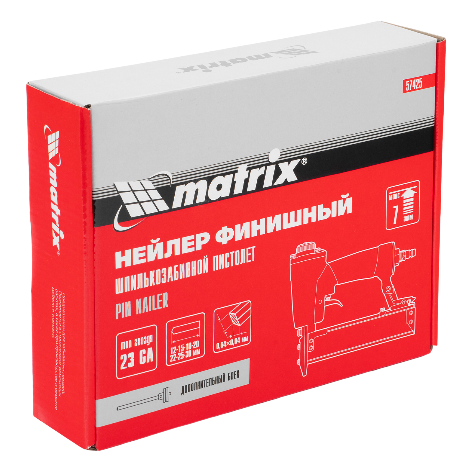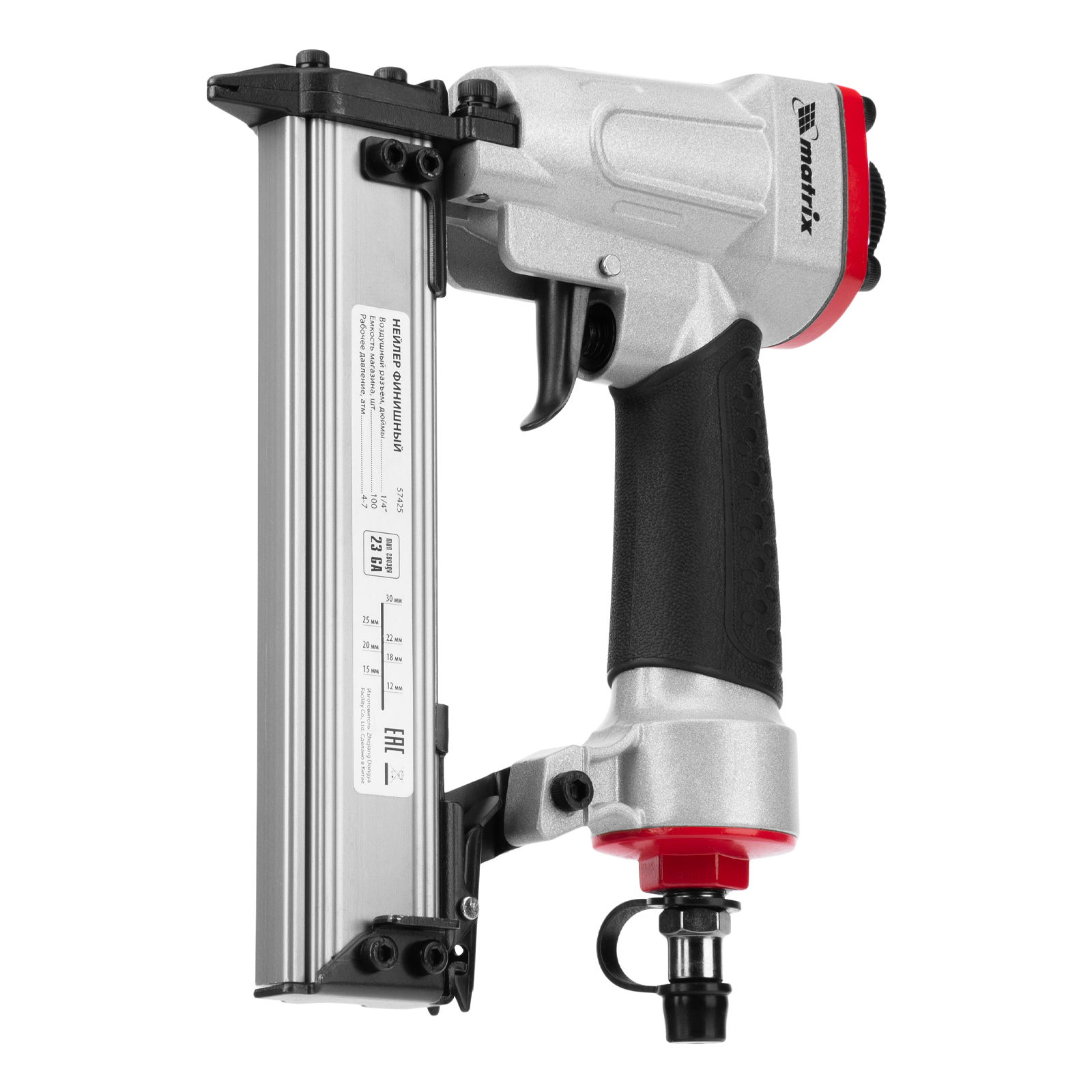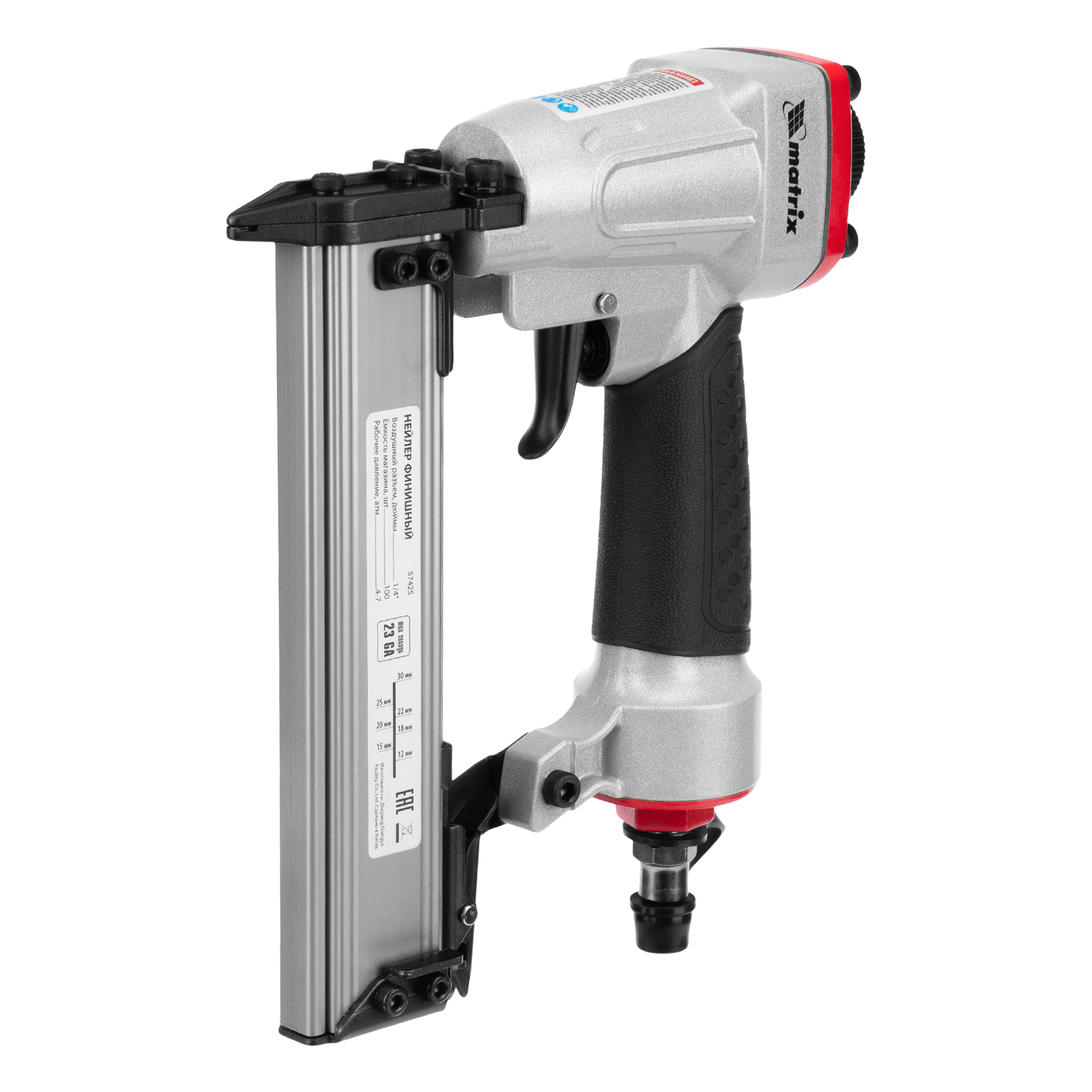 Пневматический финишный нейлер Matrix 57425 (шпилькозабивной пистолет) предназначен для забивания гвоздей 23GA диаметром 0,64 мм и длиной 10-30 мм. Он используется для финишной отделки, а также сборки мебели и производства упаковки. Благодаря низкому расходу воздуха 0,7 л/мин нейлер совместим с любым типом компрессоров.