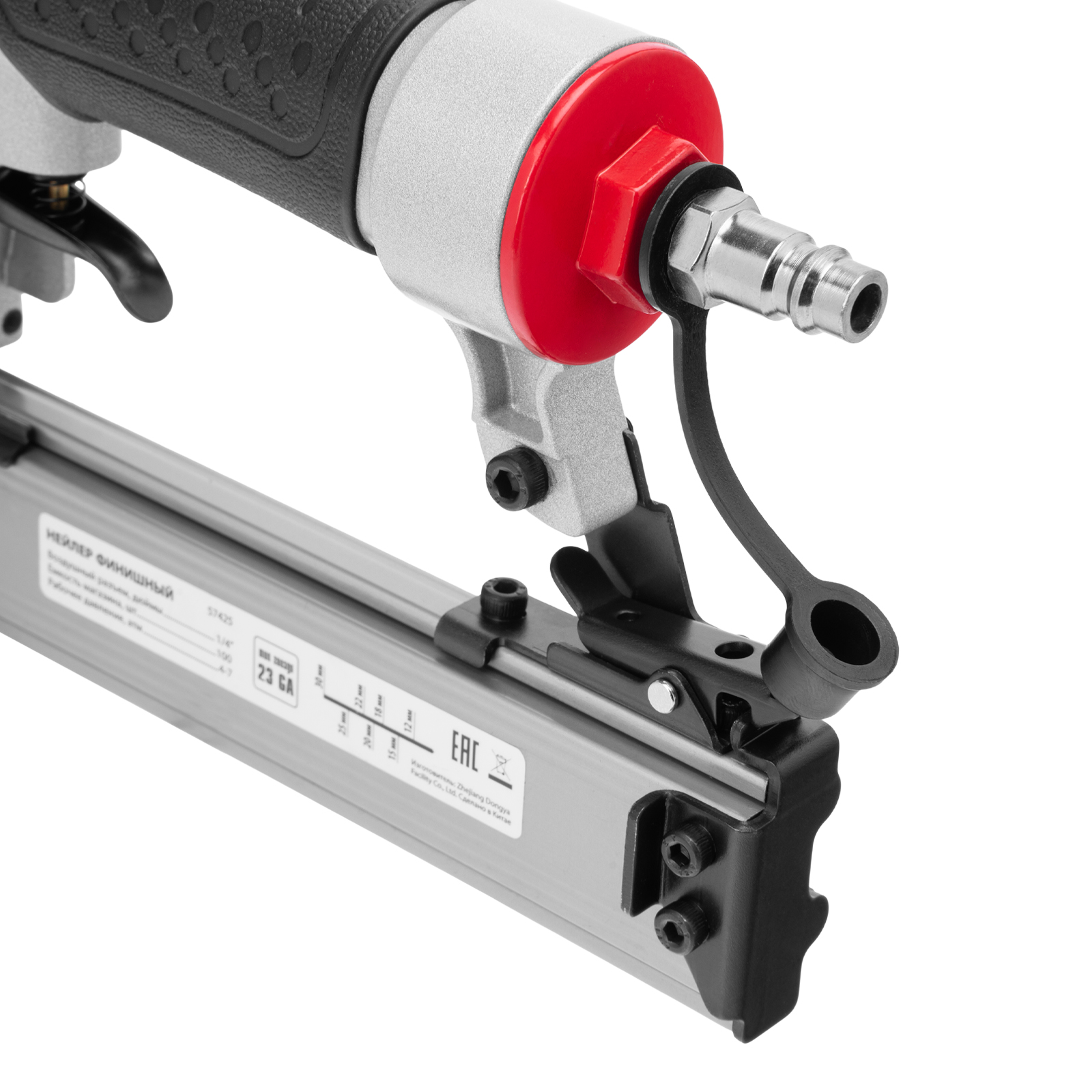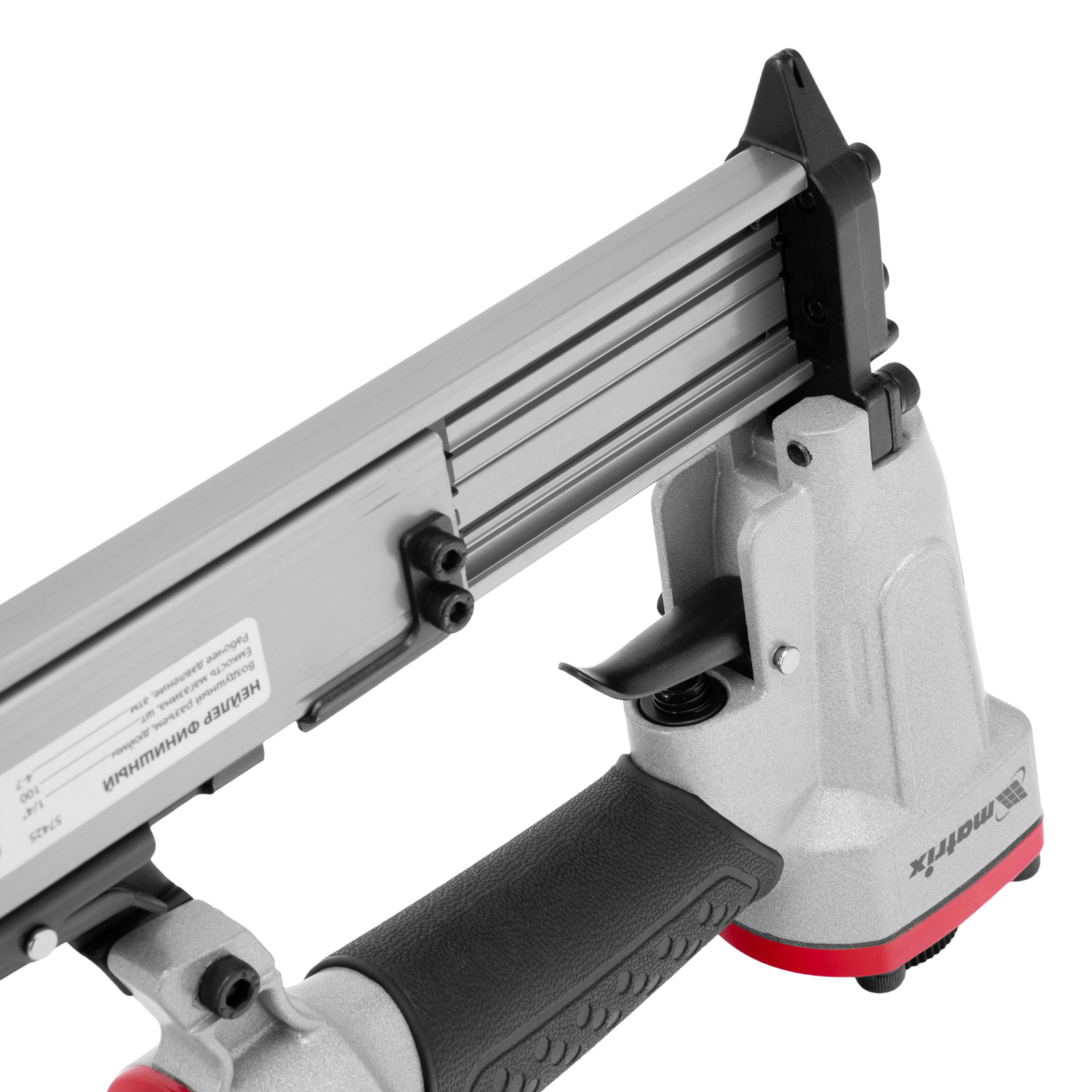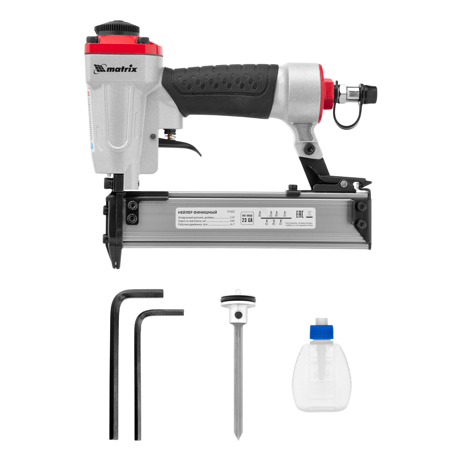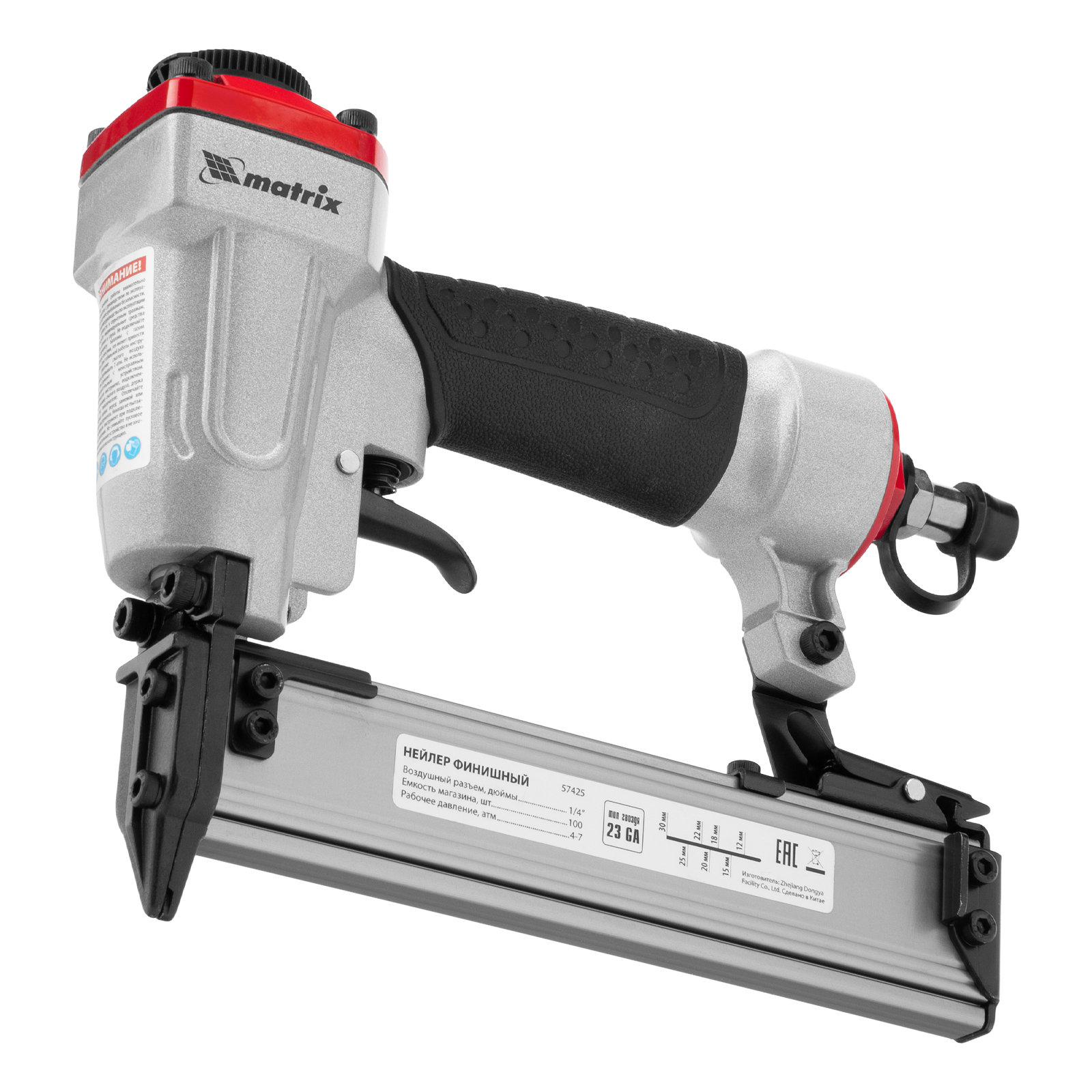 Пневматический финишный нейлер Matrix 57425 (шпилькозабивной пистолет) предназначен для забивания гвоздей 23GA диаметром 0,64 мм и длиной 10-30 мм. Он используется для финишной отделки, а также сборки мебели и производства упаковки. Благодаря низкому расходу воздуха 0,7 л/мин нейлер совместим с любым типом компрессоров.