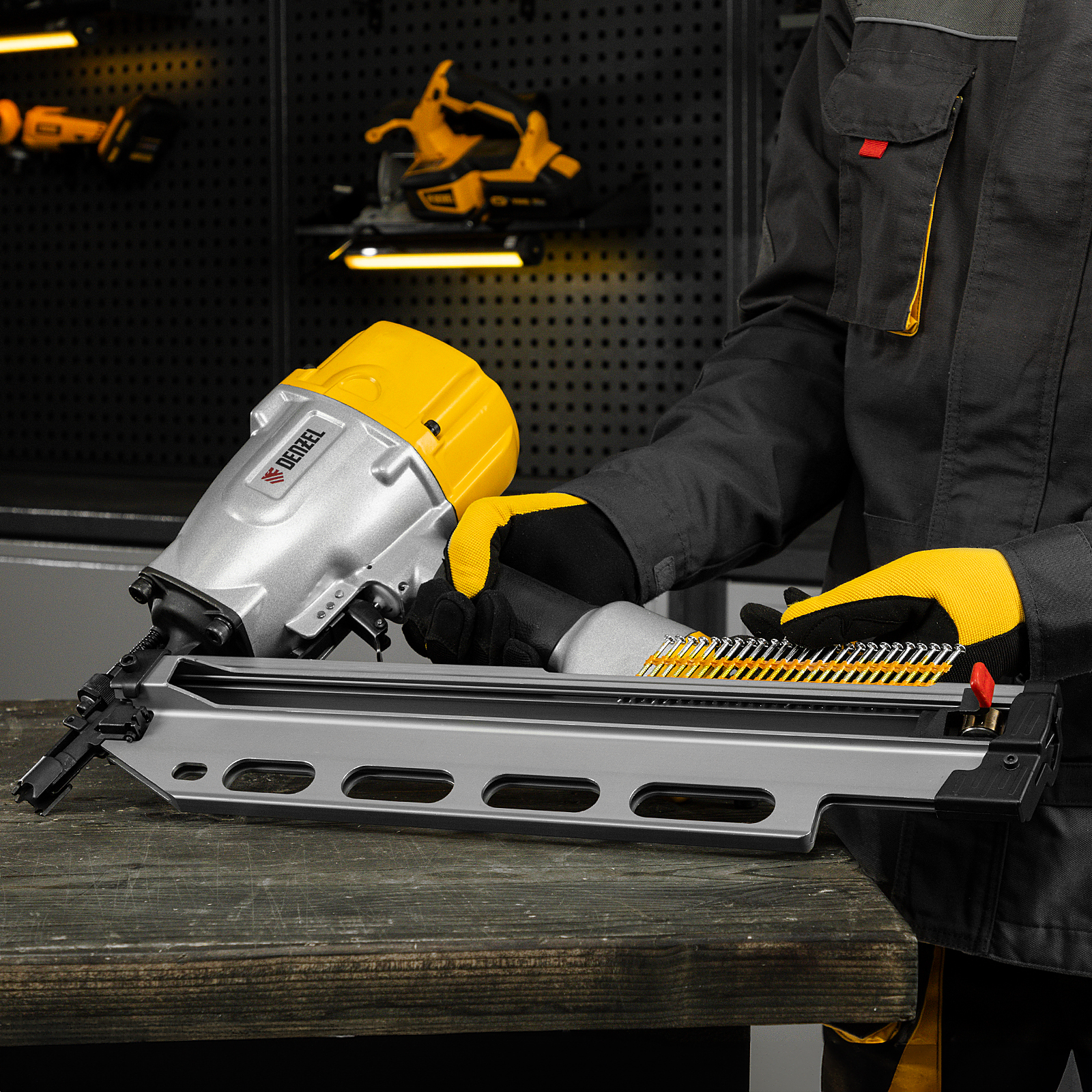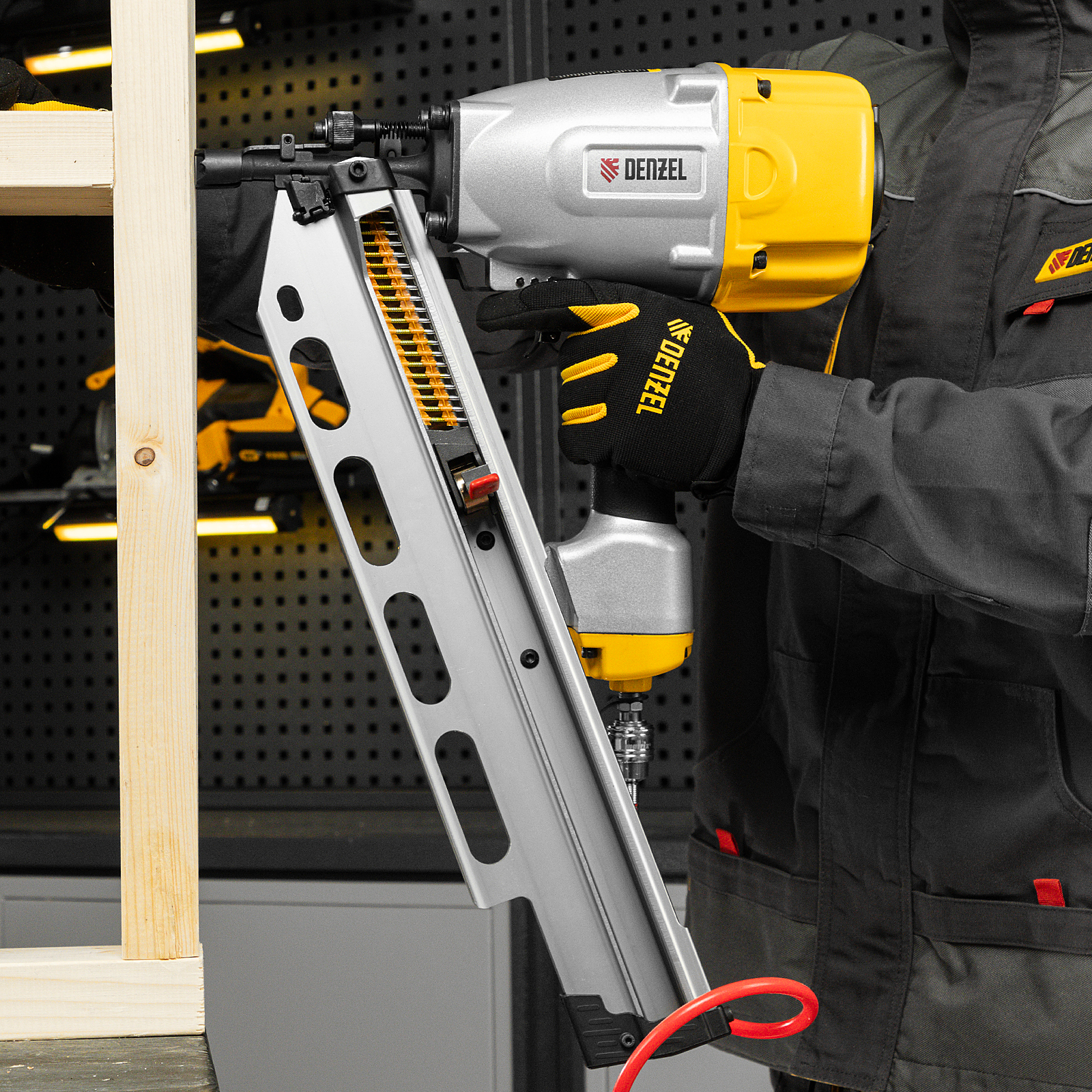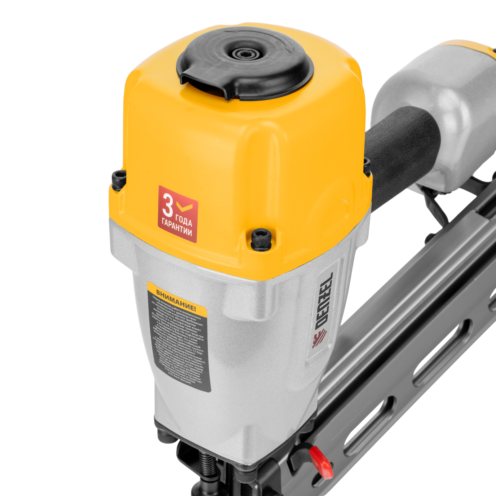 - Небольшой вес 3,8 кг — пистолет удобно удерживать одной рукой, в том числе при забивании гвоздей в вертикальные поверхности и потолок.