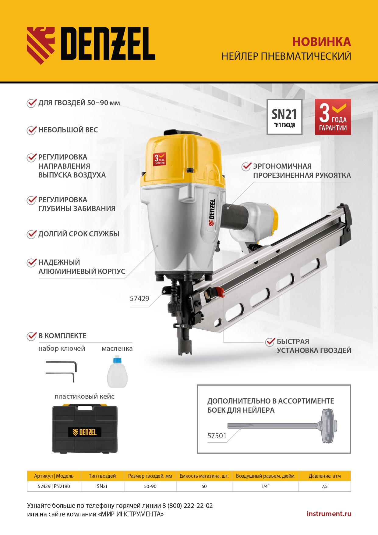 Нейлер пневматический PN2190 для гвоздей SN21 от 50 до 90 мм Denzel в Москве