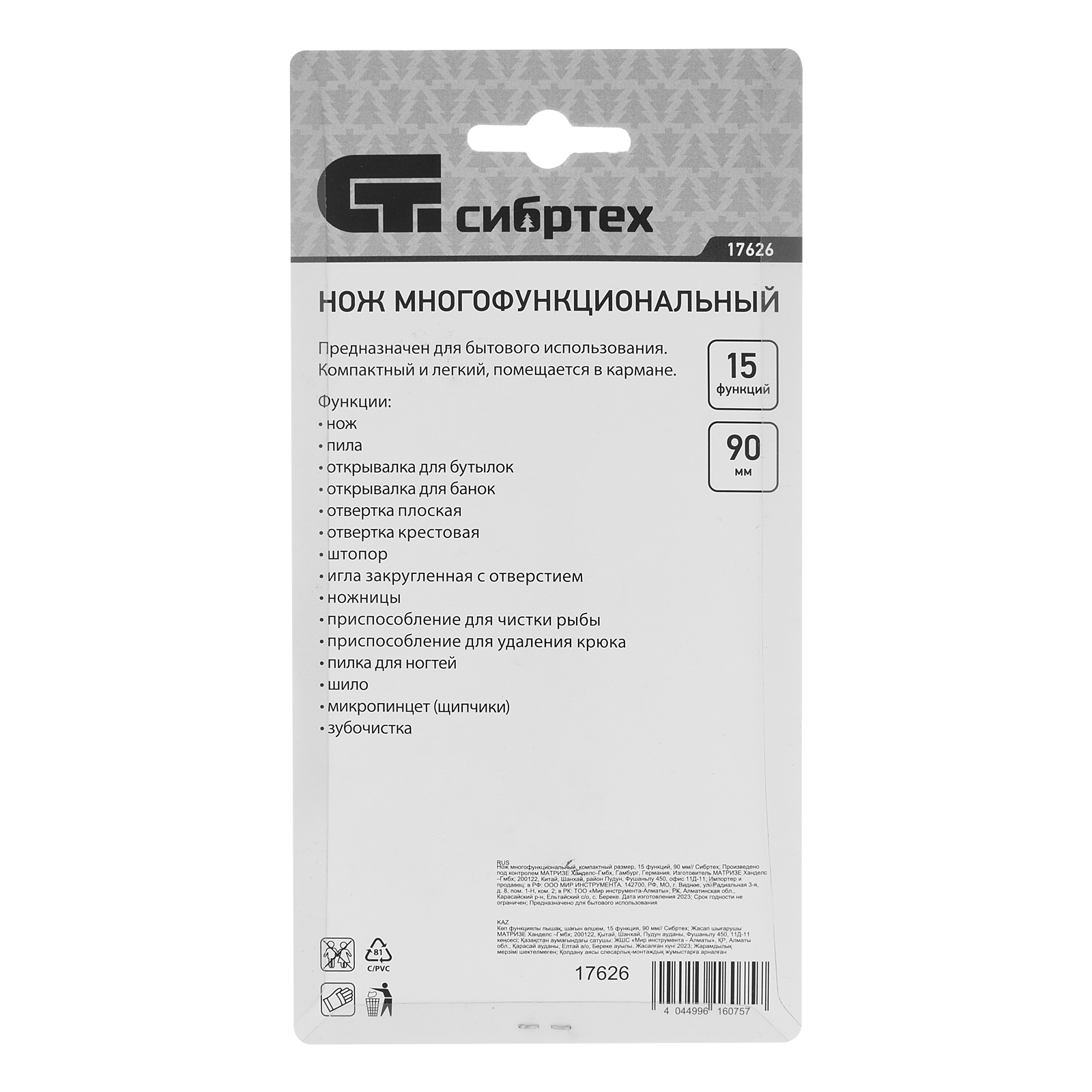 Нож многофункциональный, компактный размер, 15 функций, 90 мм Сибртех в Москве