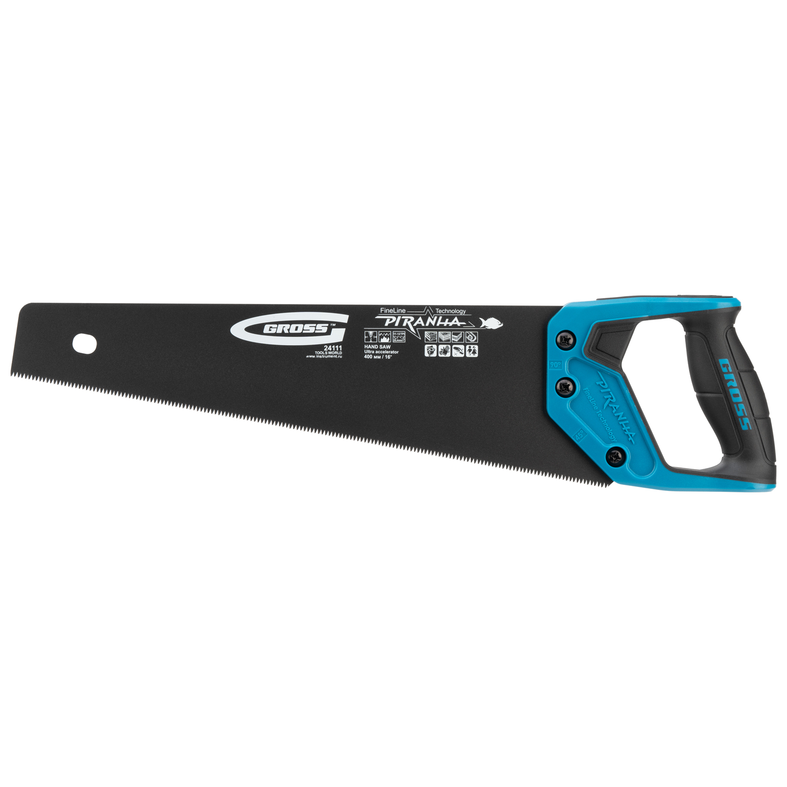 Ножовка по дереву Gross PIRANHA 24111 с полотном длиной 400 мм, калеными зубьями с 3D-заточкой и шагом 11-12 TPI, тефлоновым покрытием полотна и 2-компонентной рукояткой, используется для продольного и поперечного распиливания древесины различных пород, МДФ, ДСП, ДВП, ламината, а также пенополистирола, полиуретана и других синтетических материалов. Рабочая часть состоит из мелких зубьев с шагом 2-2,3 мм, что позволяет получить ровный и чистый рез. Трехгранная заточка зубьев увеличивает производительность инструмента без потери качества распиловки. Ножовка предназначена для столярных работ.