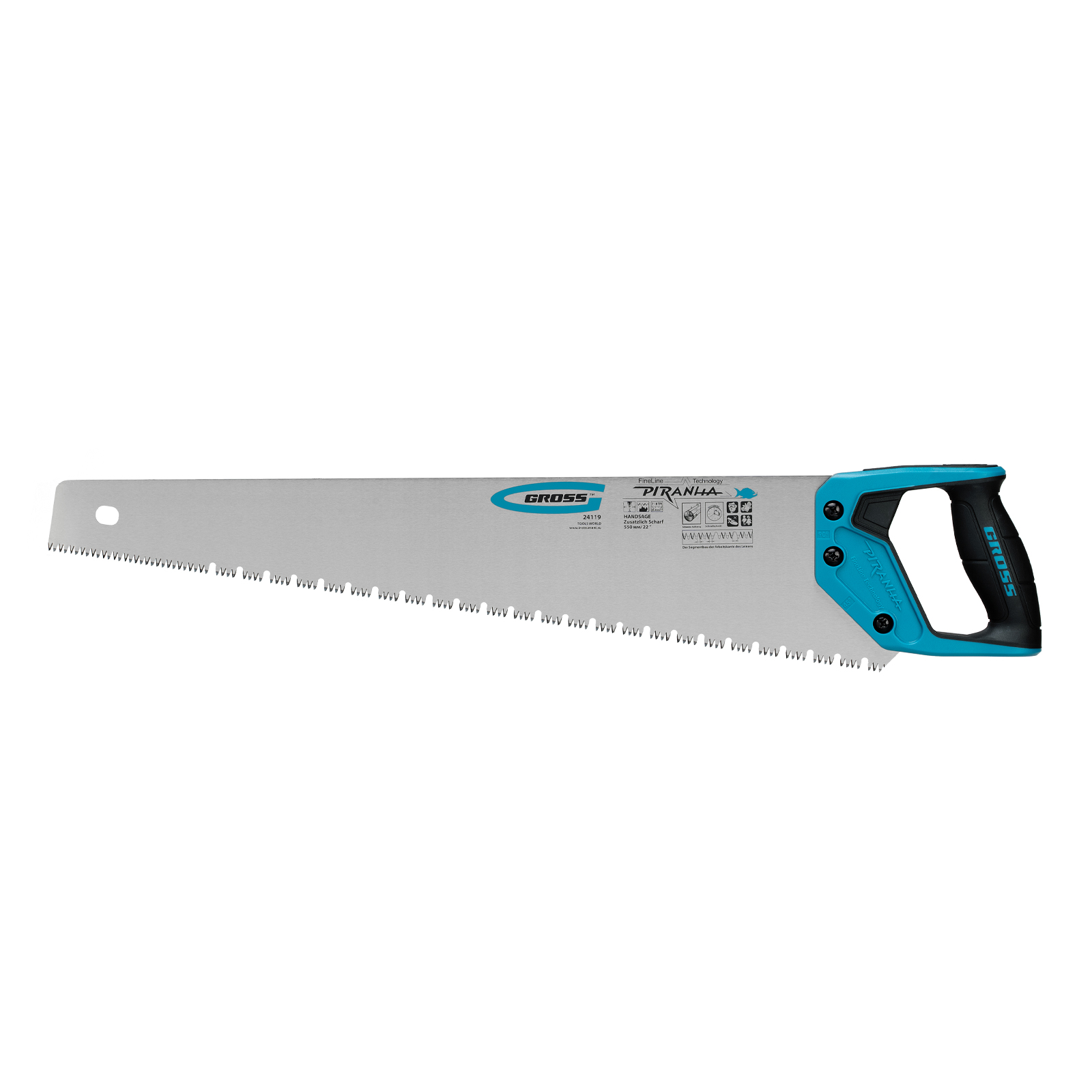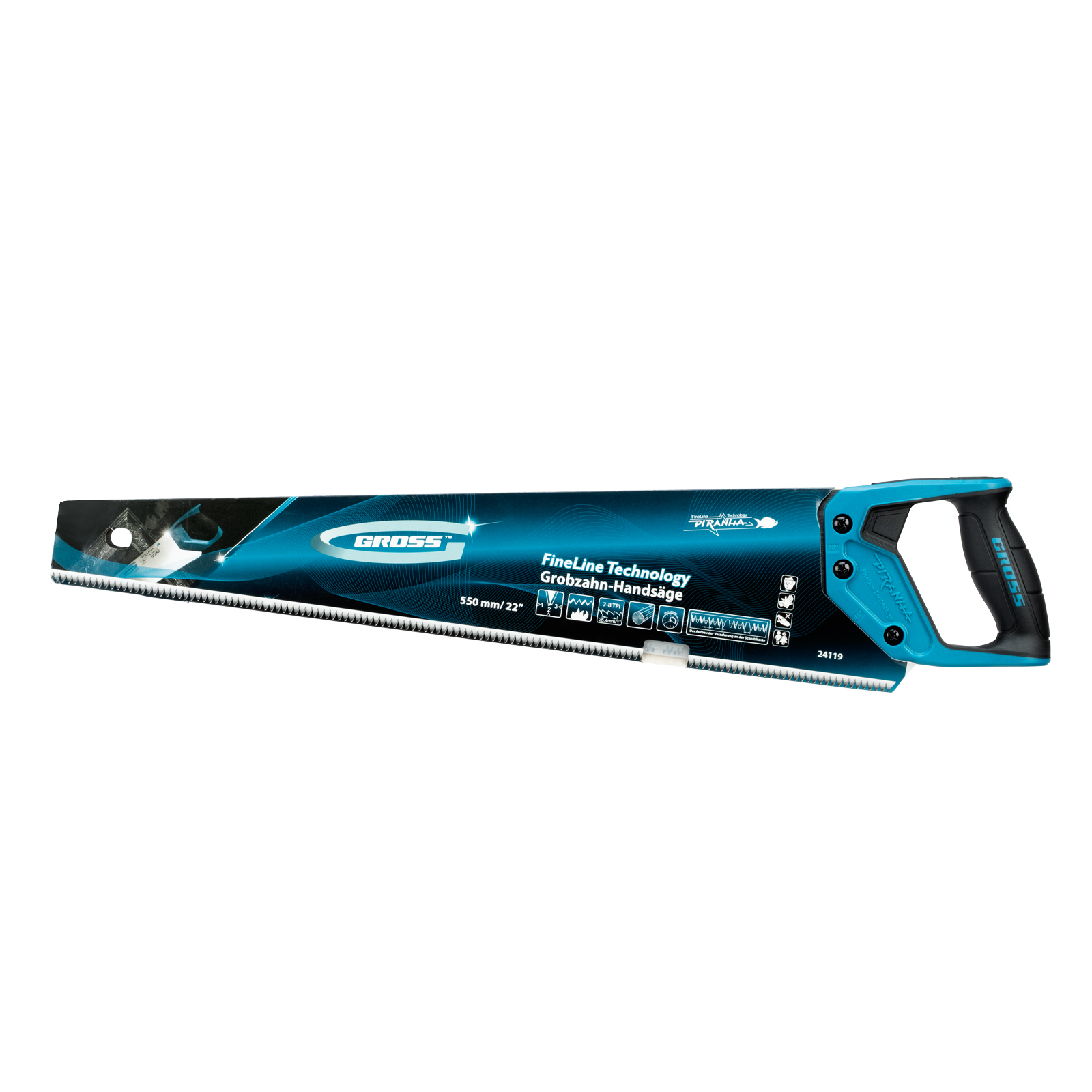 Ножовка по дереву Gross PIRANHA 24119 с полотном длиной 550 мм, зубьями с 3D-заточкой и шагом 7-8 TPI, с 2-компонентной рукояткой, имеет сегментное строение рабочей кромки и предназначена для продольного и поперечного распиливания древесины, МДФ, ДСП, ДВП, а также пенополистирола, полиуретана и других синтетических материалов. Зубья с универсальным шагом 7-8 TPI обеспечивают быстрый и ровный рез, а их трехгранная заточка увеличивает производительность ножовки. Разделение рабочей кромки на сегменты улучшает отвод стружки, благодаря чему полотно не застревает в материале заготовки. Ножовка пригодится столярам, плотникам, а также будет полезна домашним мастерам.