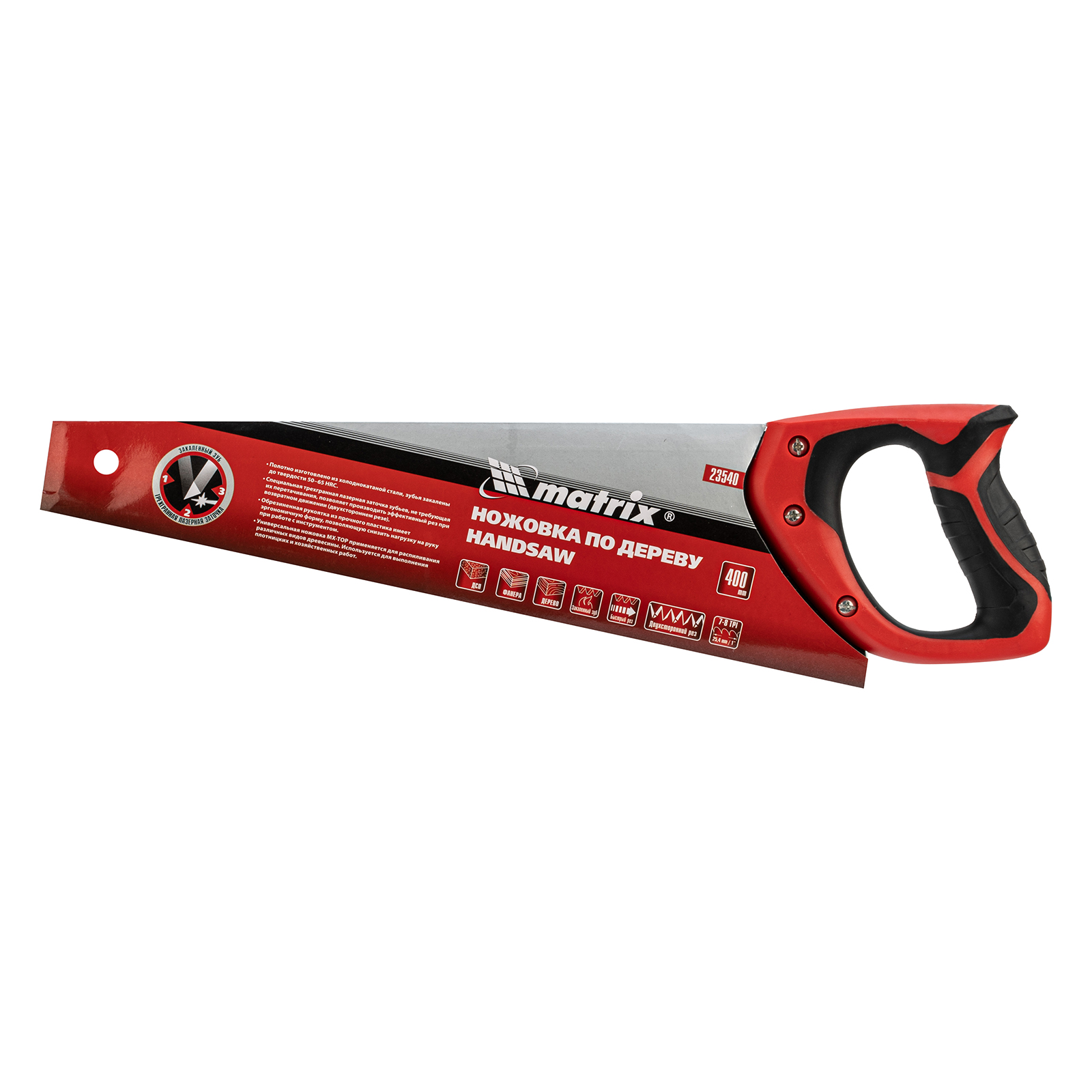 Ножовка по дереву Matrix 23540 с полотном длиной 400 мм, с калеными зубьями с 3D-заточкой и шагом 7-8 TPI, с двухкомпонентной рукояткой, используется для продольного и поперечного пиления досок, брусков, листов фанеры, ДСП. Благодаря трехгранной заточке зубьев пила характеризуется высокой производительностью. Шаг зубьев составляет 7-8 TPI, что обеспечивает быстрый и качественный рез. Ножовка пригодится в столярной мастерской, а также будет полезна в хозяйстве.