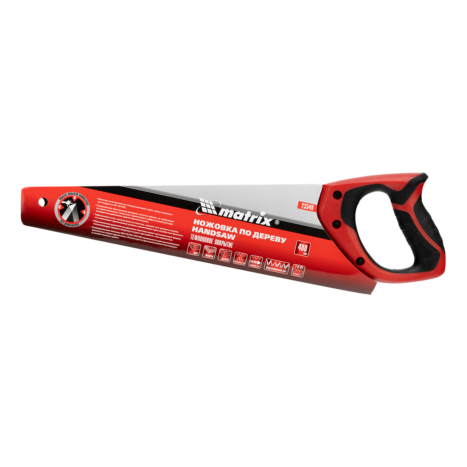 Ножовка по дереву Matrix 23549 с полотном длиной 400 мм, калеными зубьями с шагом 7-8 TPI и 3D-заточкой, с тефлоновым покрытием полотна и 2-компонентной рукояткой, пилит древесину, фанеру и ДСП. Подходит для продольного и поперечного пиления, используется для быстрой распиловки заготовок. Трехгранная заточка зубьев обеспечивает повышенную производительность. Ножовка будет полезна столяру, плотнику, пригодится также в домашнем хозяйстве.