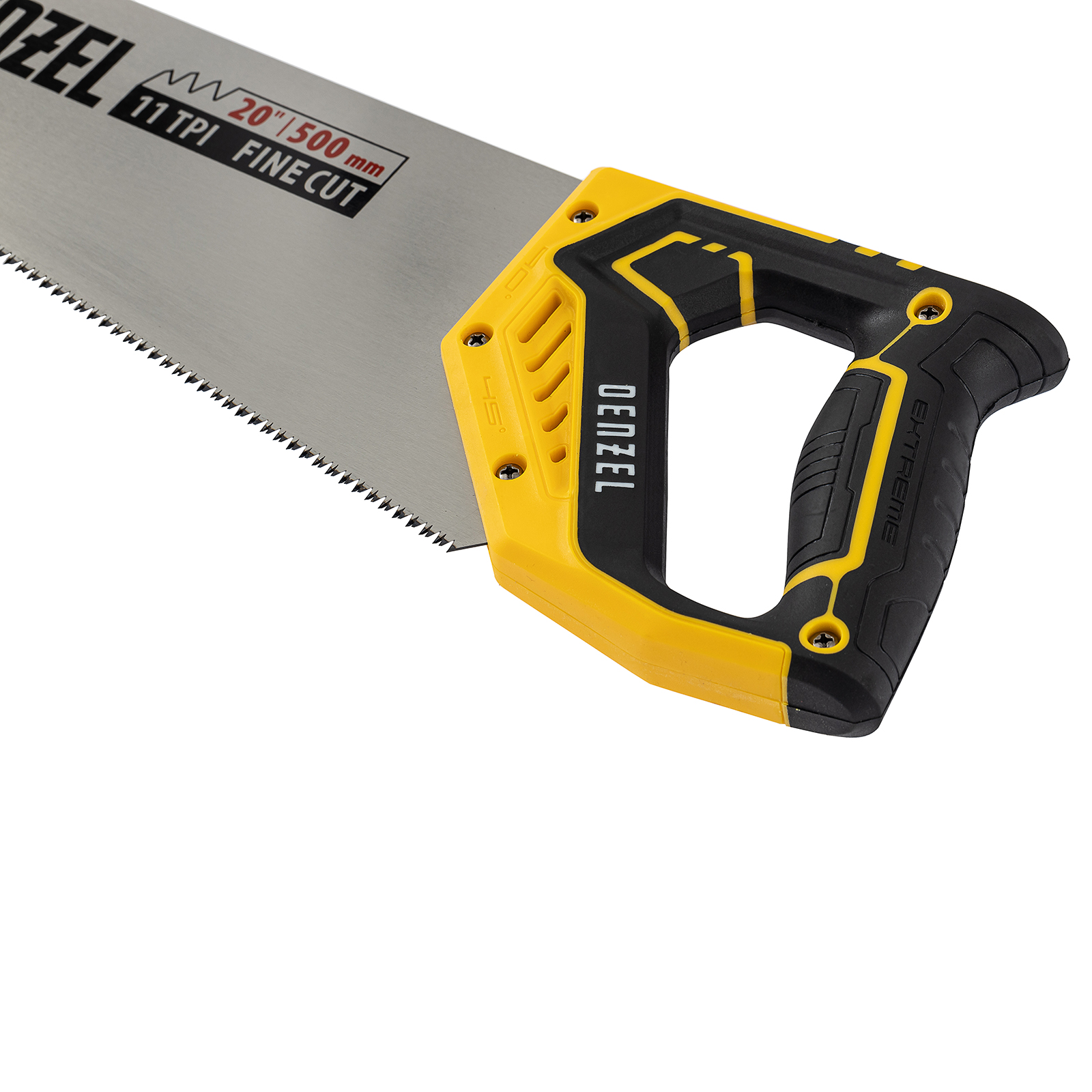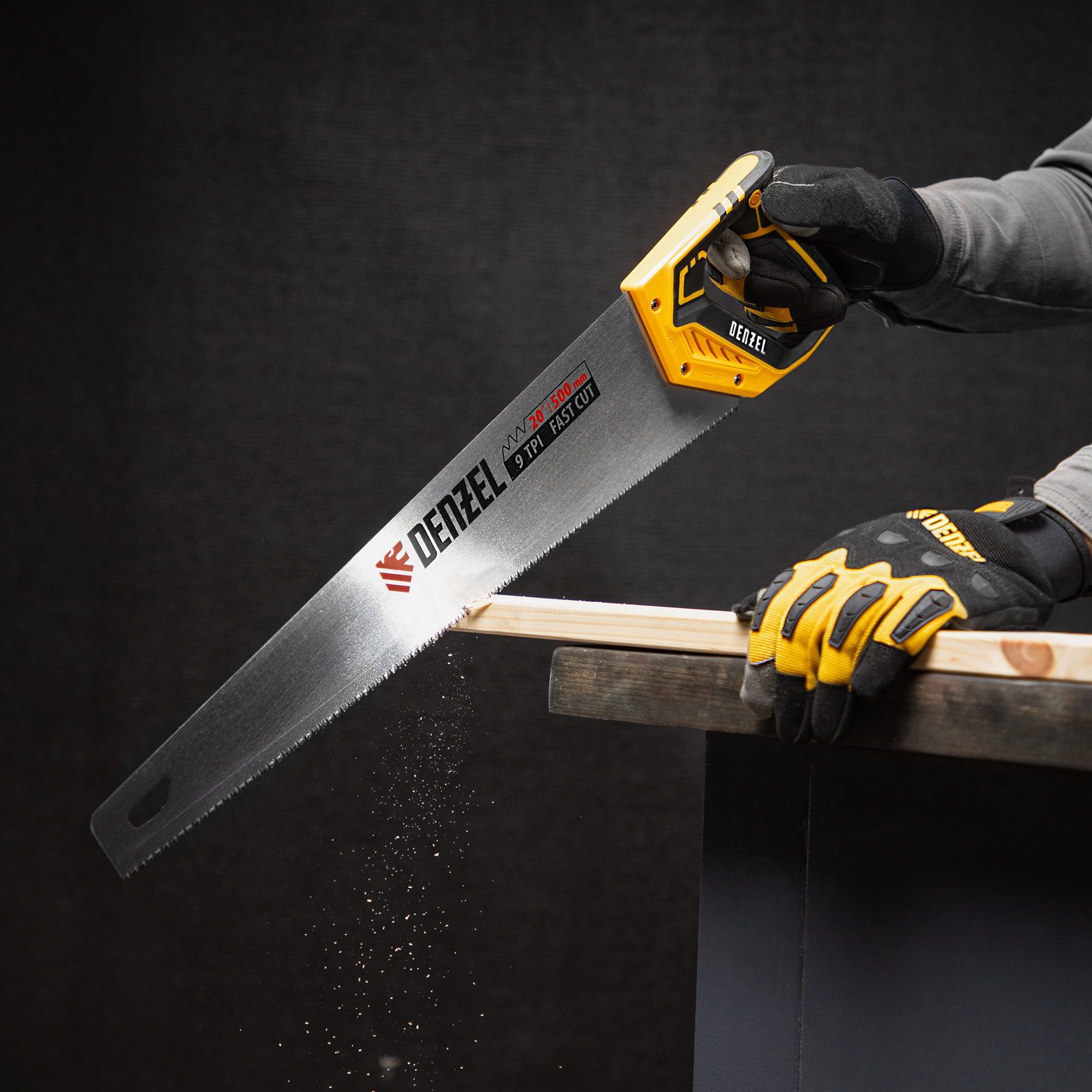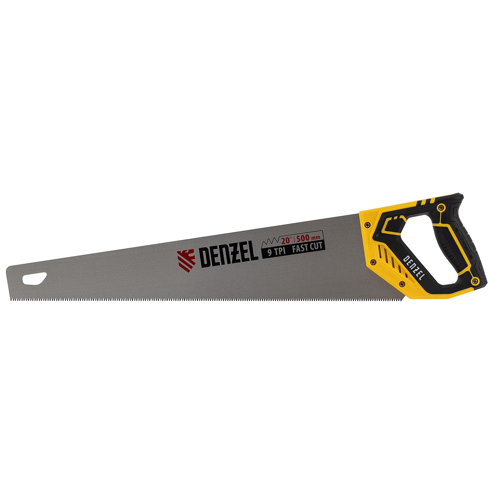 Ножовка по дереву Denzel 24147 длиной 500 мм, с зубьями с шагом 9 TPI и 3D-заточкой, с двухкомпонентной рукояткой, предназначена для продольной и поперечной распиловки заготовок из древесины, ДСП, ДВП, МДФ, ламината, а также из ПВХ (труб, панелей, коробов). Подходит для спиливания молодых веток. Зубья с шагом 9 TPI позволяют выполнять быстрый рез. Ножовка используется для проведения столярных работ в мастерской и на дачном участке.
