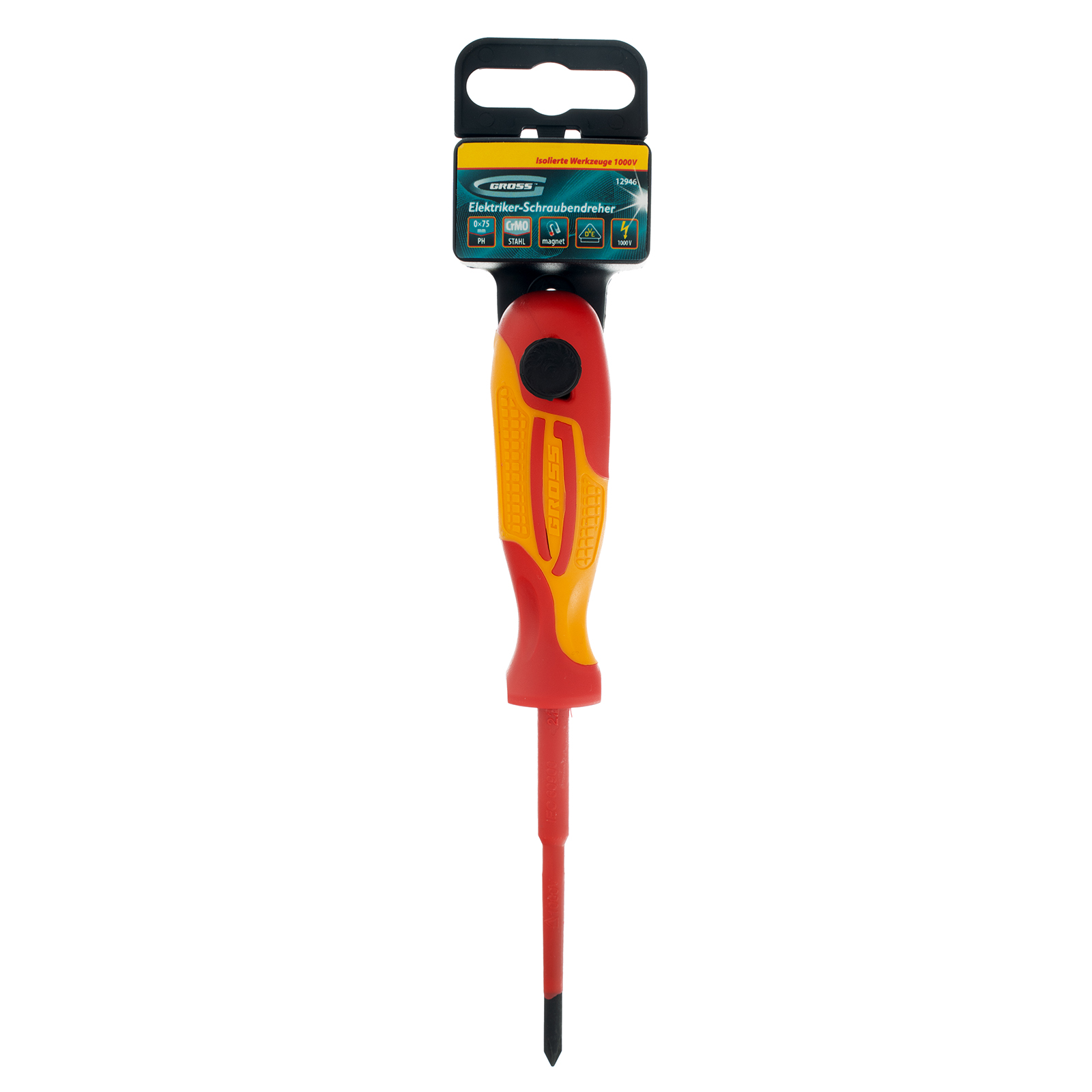 Диэлектрическая отвертка Gross 12946 до 1000 В, PH0 х 75 мм, из стали CrMo, с двухкомпонентной рукояткой, применяется при проведении работ с крепежом типа Phillips. С ее помощью можно установить электросчетчики, клеммники, розетки и т.д. Отвертка со стержнем длиной 75 мм оптимально подходит для работы на поверхностях и в углублениях. Внимание — техника безопасности запрещает выполнять работы под напряжением!