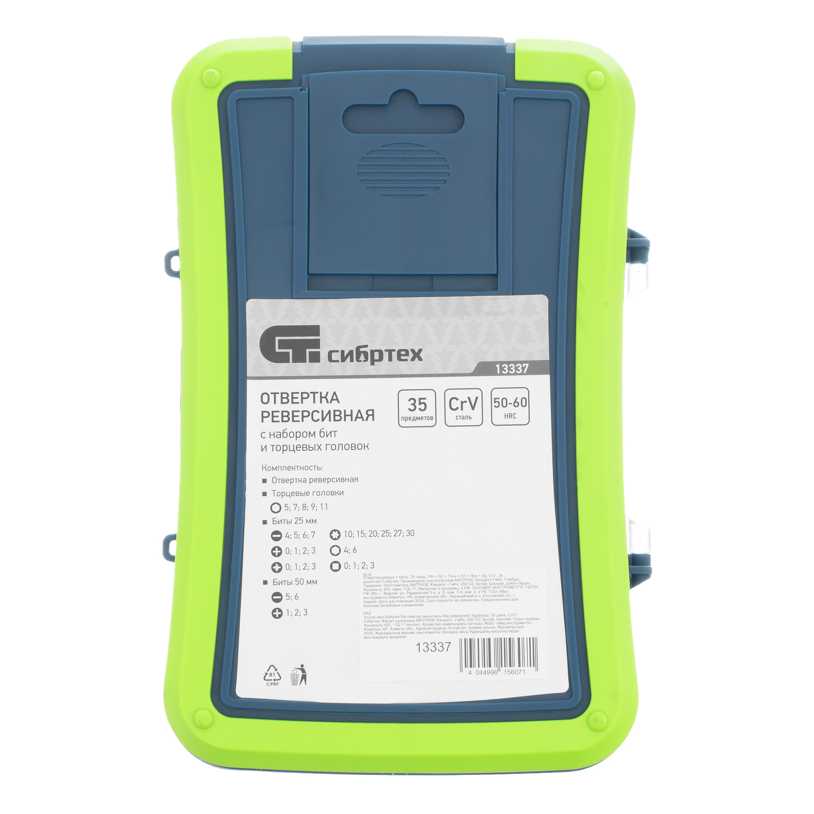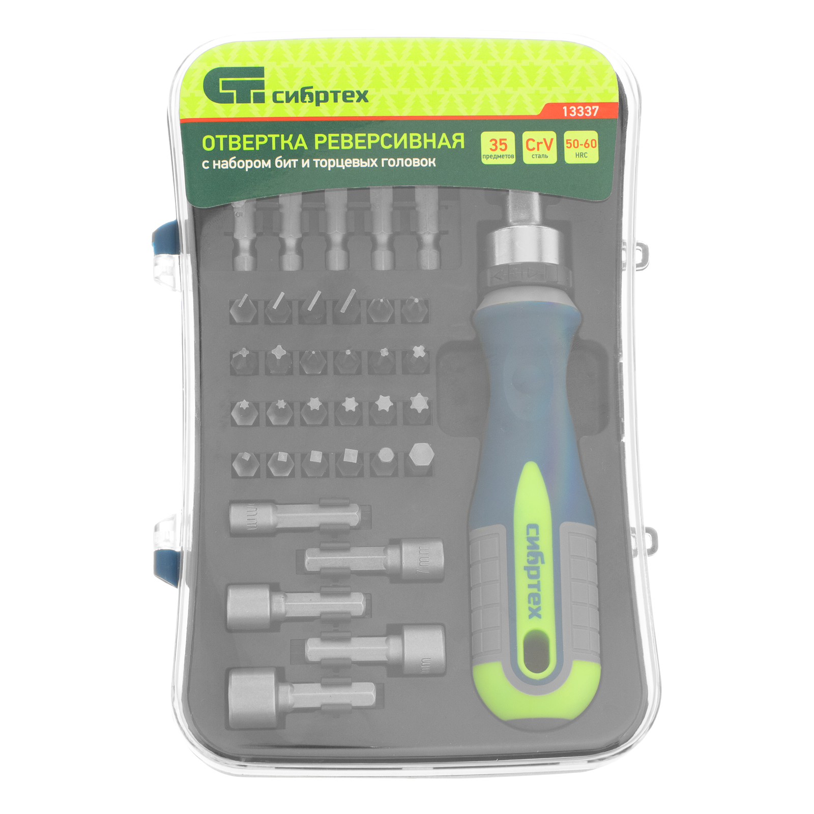 Отвертка реверсивная с набором бит и торцевыми головками, 35 шт, CrV Сибртех в Москве