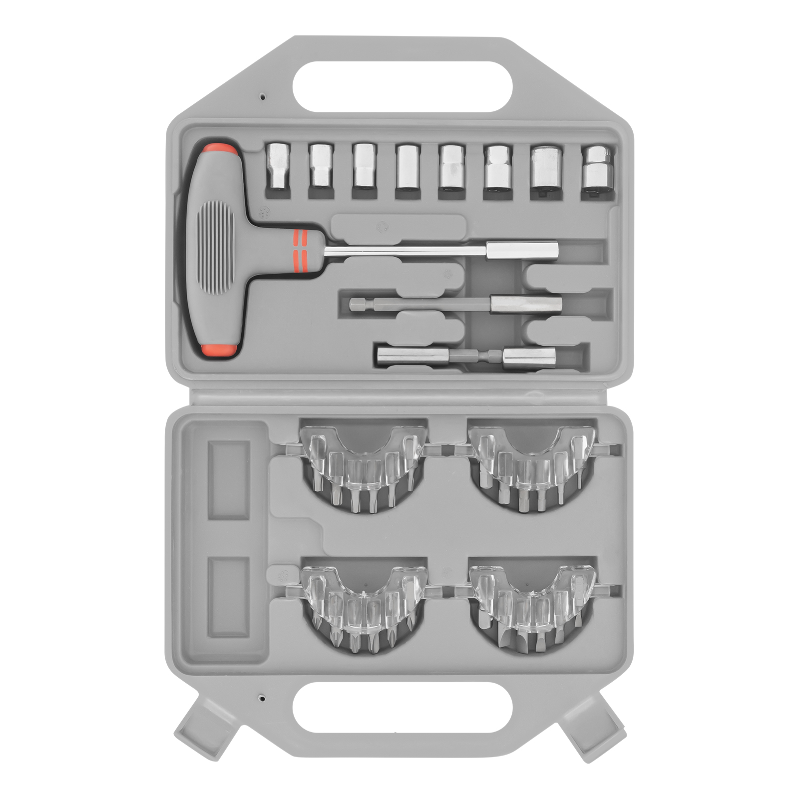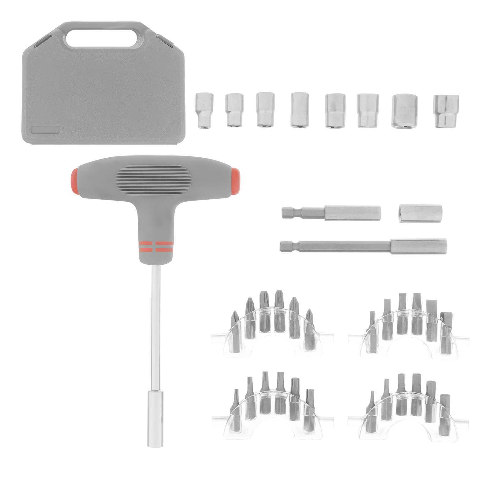Отвертка Т-образная - 1 штБиты 25 мм: РН1, РН2, РН3, PZ1, PZ2, PZ3, SL3, SL4, SL5, SL6, SL7, H2, H3, H4, H5, H5.5, H6, T10, T15, T20, T25, T27, T30 - 23 штТорцевые головки: 4, 6, 7, 8, 9, 10, 11, 12 мм - 8 штБитодержатели: 60 мм, 90 мм - 2 штПереходник для бит - 1 штАдаптер для торцевых головок 25 мм - 1 шт |