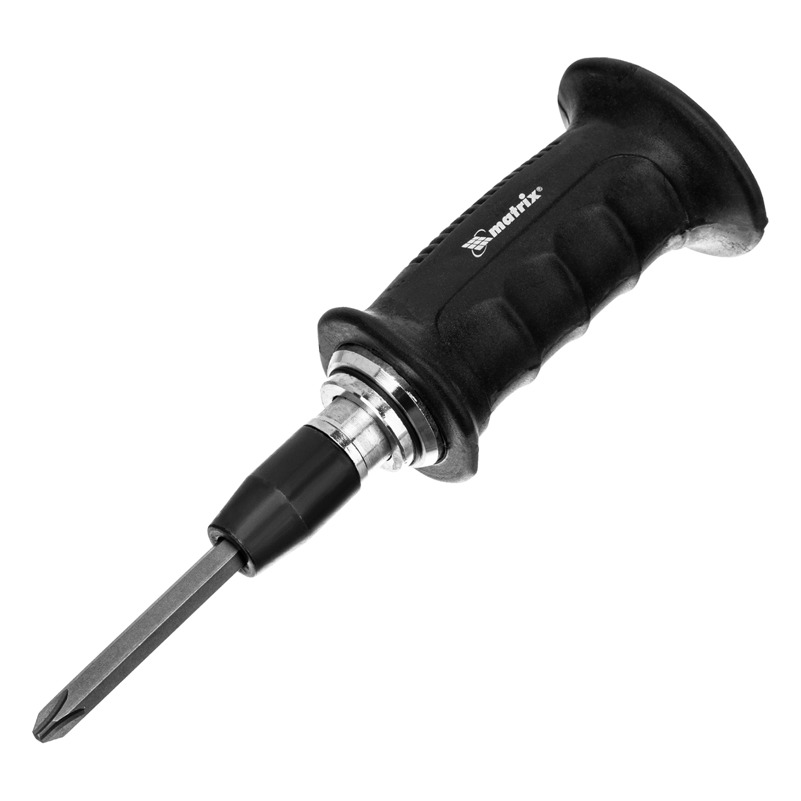 Ударно-поворотная отвертка Matrix 11561 с черной ручкой, с присоединительным шестигранником 1/2", с набором из 6 бит., в пластиковом кейсе, предназначена для работы с резьбовыми соединениями, в том числе для демонтажа перетянутых или заржавевших крепежей. Металлический затыльник выдерживает удары молотком. Отвертка используется при проведении ремонта автомобильной и другой техники, рекомендована для профессионального применения.