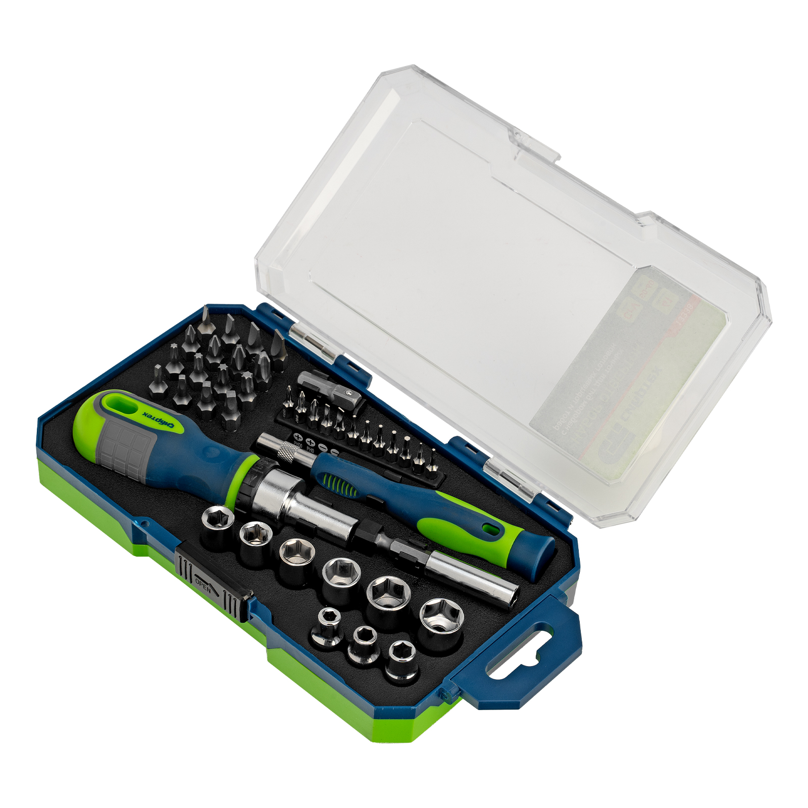Отвертка реверсивная для бит 1/4" - 1 штОтвертка для точных работ - 1 штУдлинитель 1/4" - 1 штПереходник для торцевых головок 1/4" - 1 штТорцевые головки: 4, 5, 6, 7, 8, 9, 10, 11, 12 мм - 9 штБиты 1/4": SL3, SL4, SL5, SL6, PH0, PH1, PH2, PH3 - 8 шт Биты 1/4": Т10, Т15, Т20, Т25, S0, S1, S2, S3 - 8 штБиты для точных работ: SL2, SL3, Т5, Т6 - 2 шт Биты для точных работ: PH000, PH00, PH0 - 3 шт Биты для точных работ: Pb 0.8, 1.2 - 2 штБиты для точных работ: H1.3, Н1.5, Н2.0 - 3 шт |