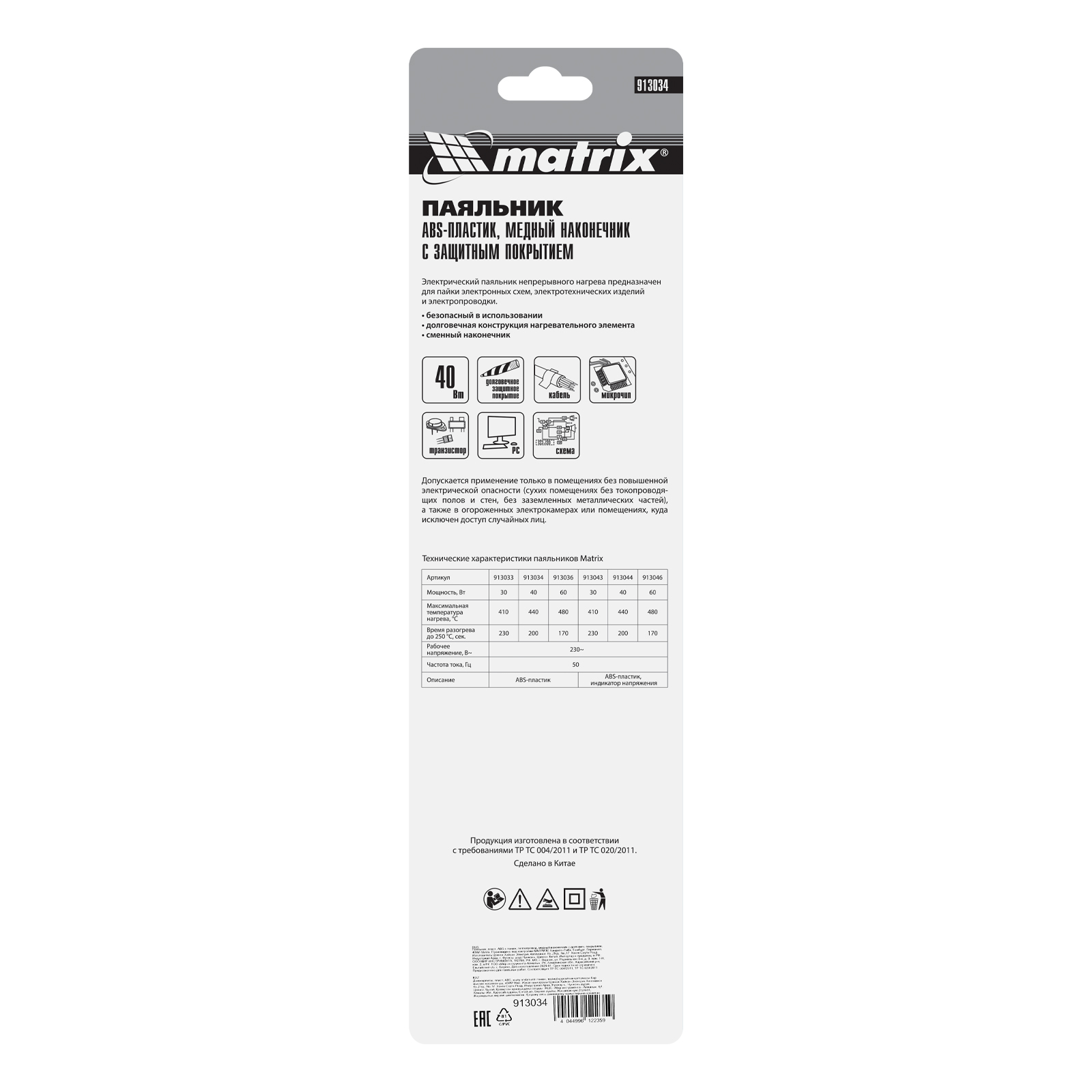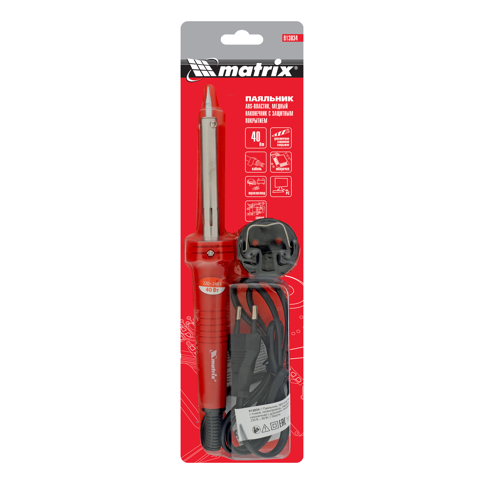 Паяльник, пластик ABS с пониженной теплопроводностью, медный наконечник с долговечным покрытием, 220 В, 40 W Matrix в Москве